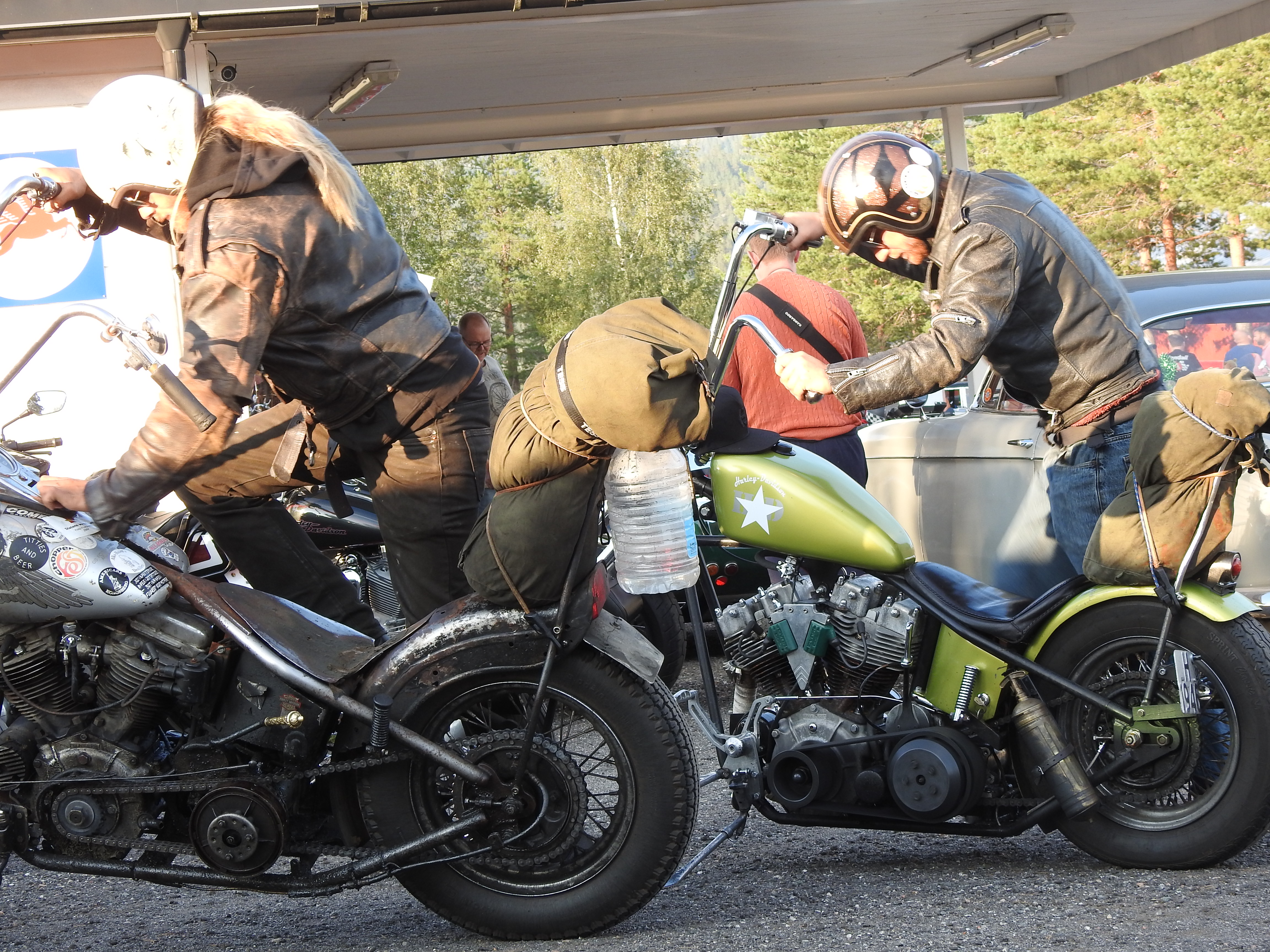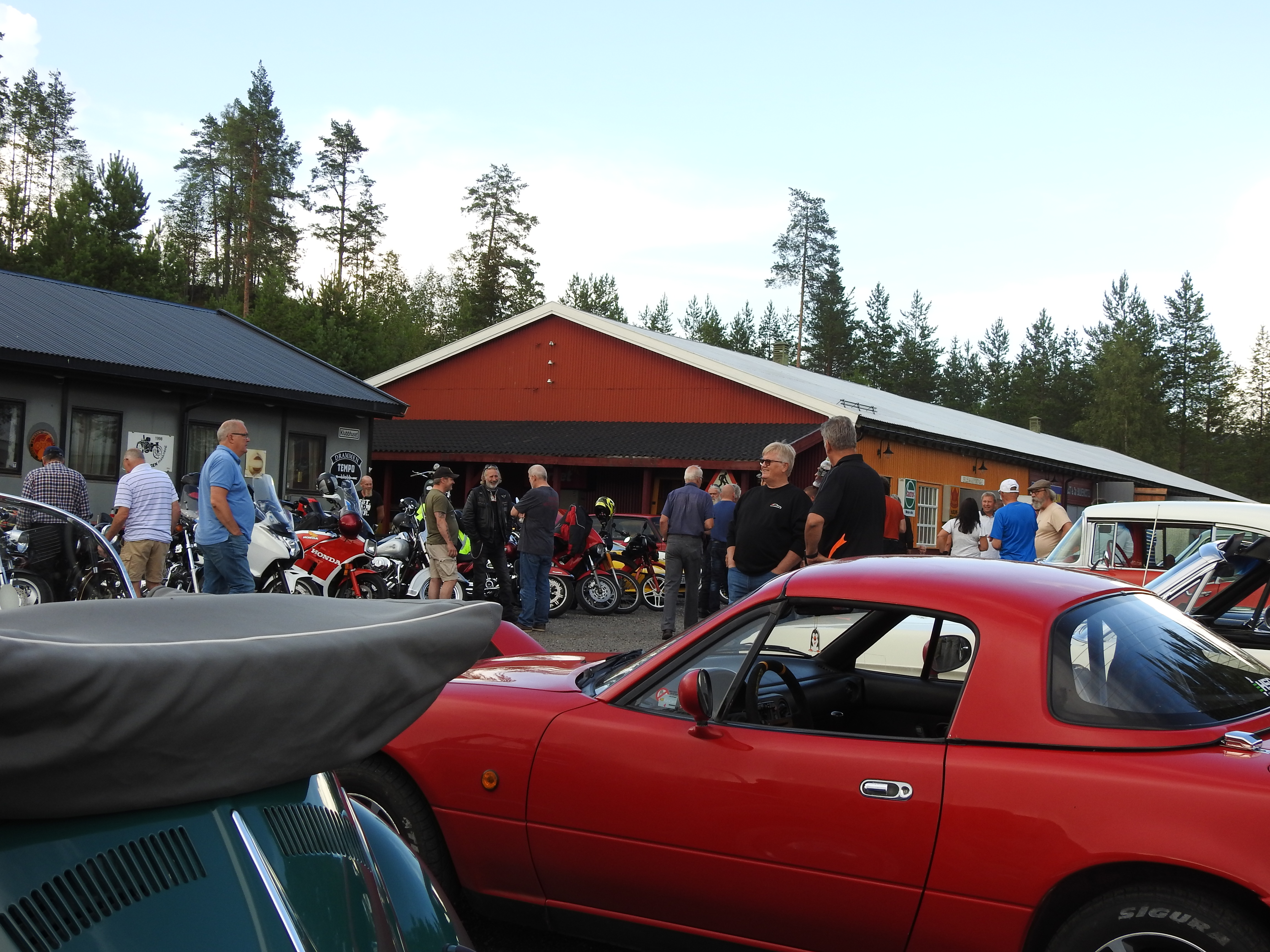 Masse gamle kjente og masse nye folk og kjøretøyer. Vi fikk se alt fra moped til militær lastebil. Den som gjorde mest inntrykk var en kar som kjørte gammel Harley uten fjæring bak. Han hadde ikke sete heller, satt rett på bakskjermen. Neppe noen nytelse, men småtøft var det.