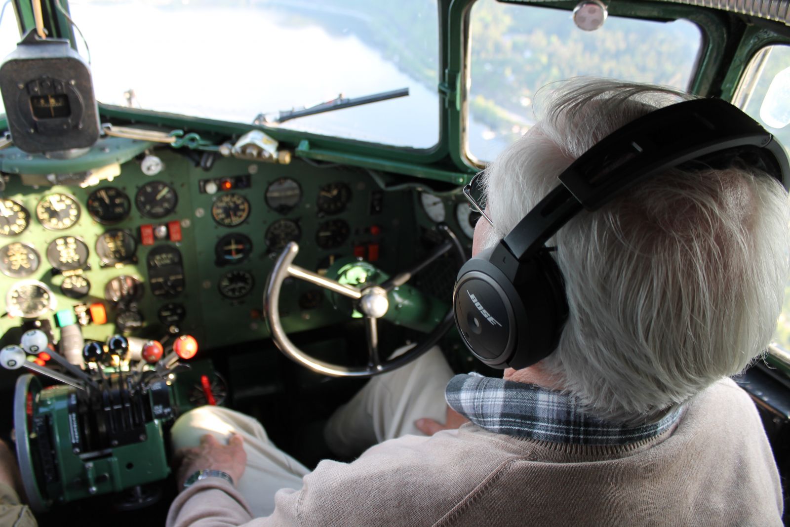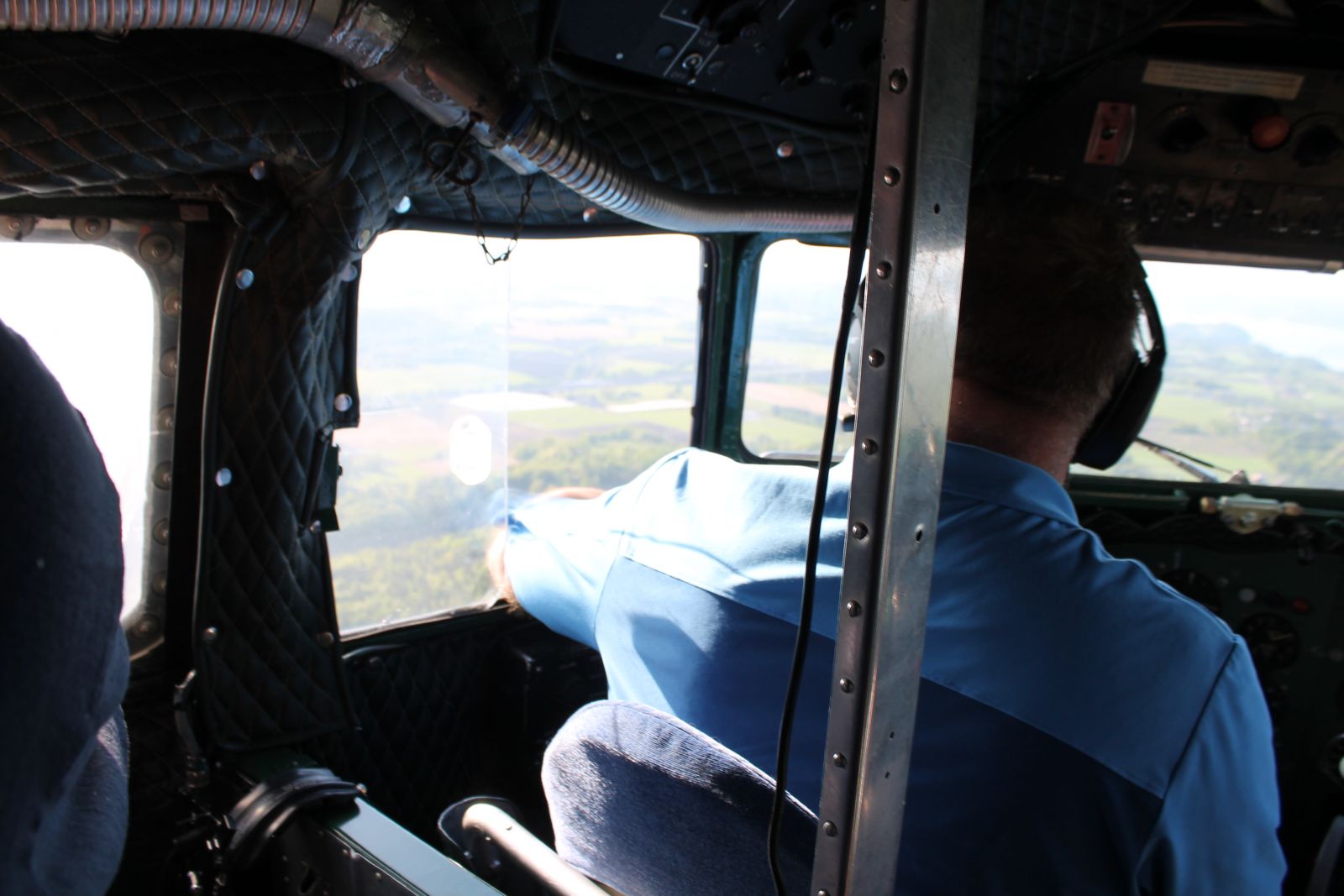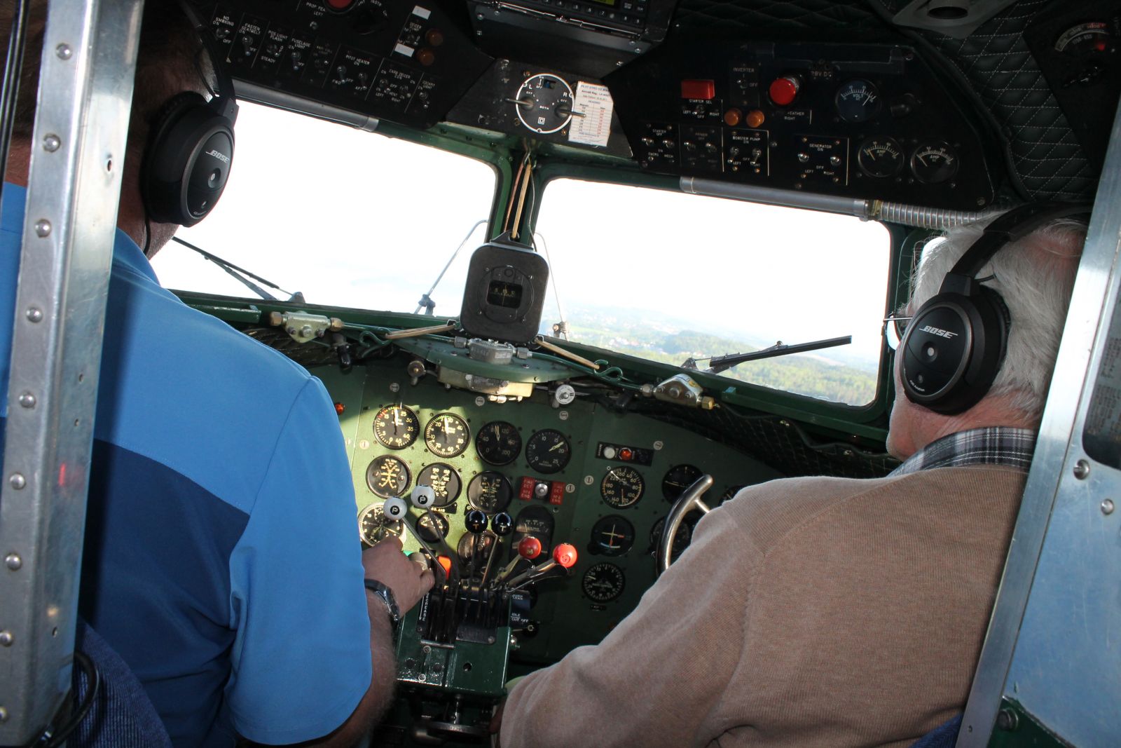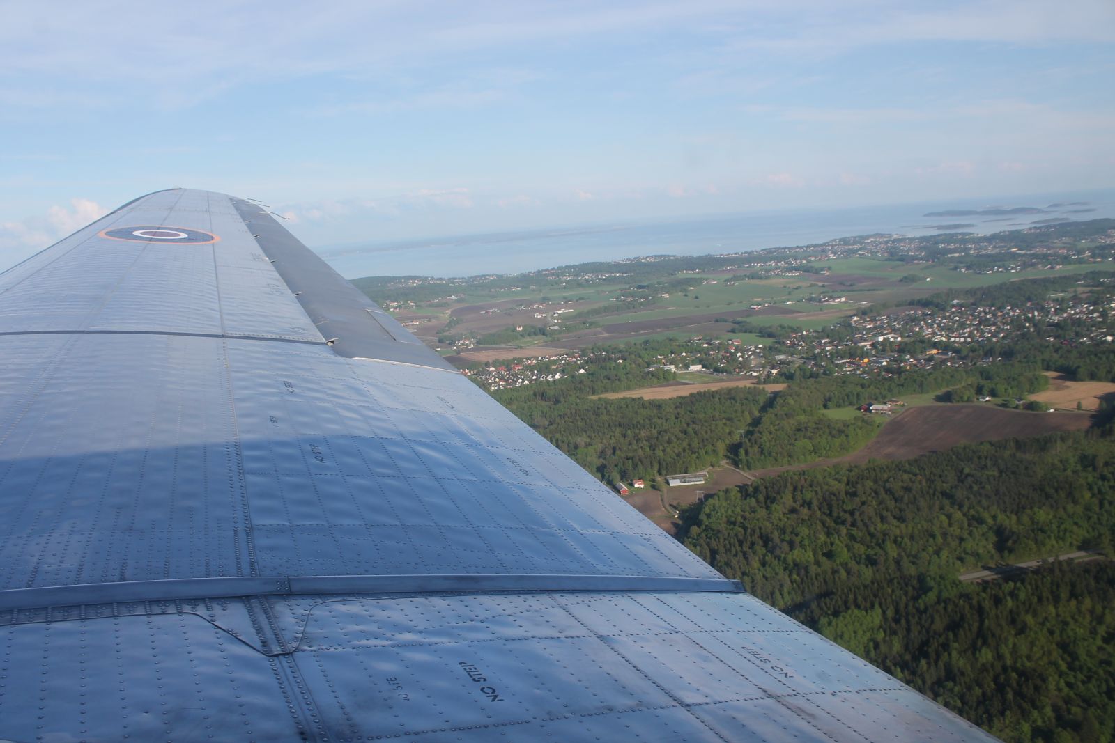 Mandag 27. mai opprant med et ufyselig vær. Vi hadde for mange måneder siden bestemt at denne dagen skulle vi fly Dakota. Utpå ettermiddagen sprakk skydekket opp og 19 mann kastet seg i klubbens buss og satte kursen for Torp. Innen vi kom dit var været helt strålende. Inn i den 70 år gamle maskinen strømmet vi forventningsfulle mannfolk. Flyet er voksen i alder, men den ene piloten ombord var eldre - han var 80 år. Samme pilot som fløy oss i 1993. Vi fløy kysten oppover, inn over Hurumlandet og opp Drammensfjorden. Gjorde en stor sving over Drammen, en stor sving over Konnerud før vi fortsatte videre til Hokksund og tok en æressving over der også. En drøy time med kos av høy kvalitet. Ingen frykt for gærninger i cocpit her, neida vi var alle der. Koselig og en smule eindommelig er det også å se piloten sitter med armen ut av vinduet. På vei hjem stoppet vi og nøt øl og krem på ei veikro. Bussen ble atter parkert under tak på Burud og en lang flott kvekld var brakt til ende. Stor suksess og jækla moro.