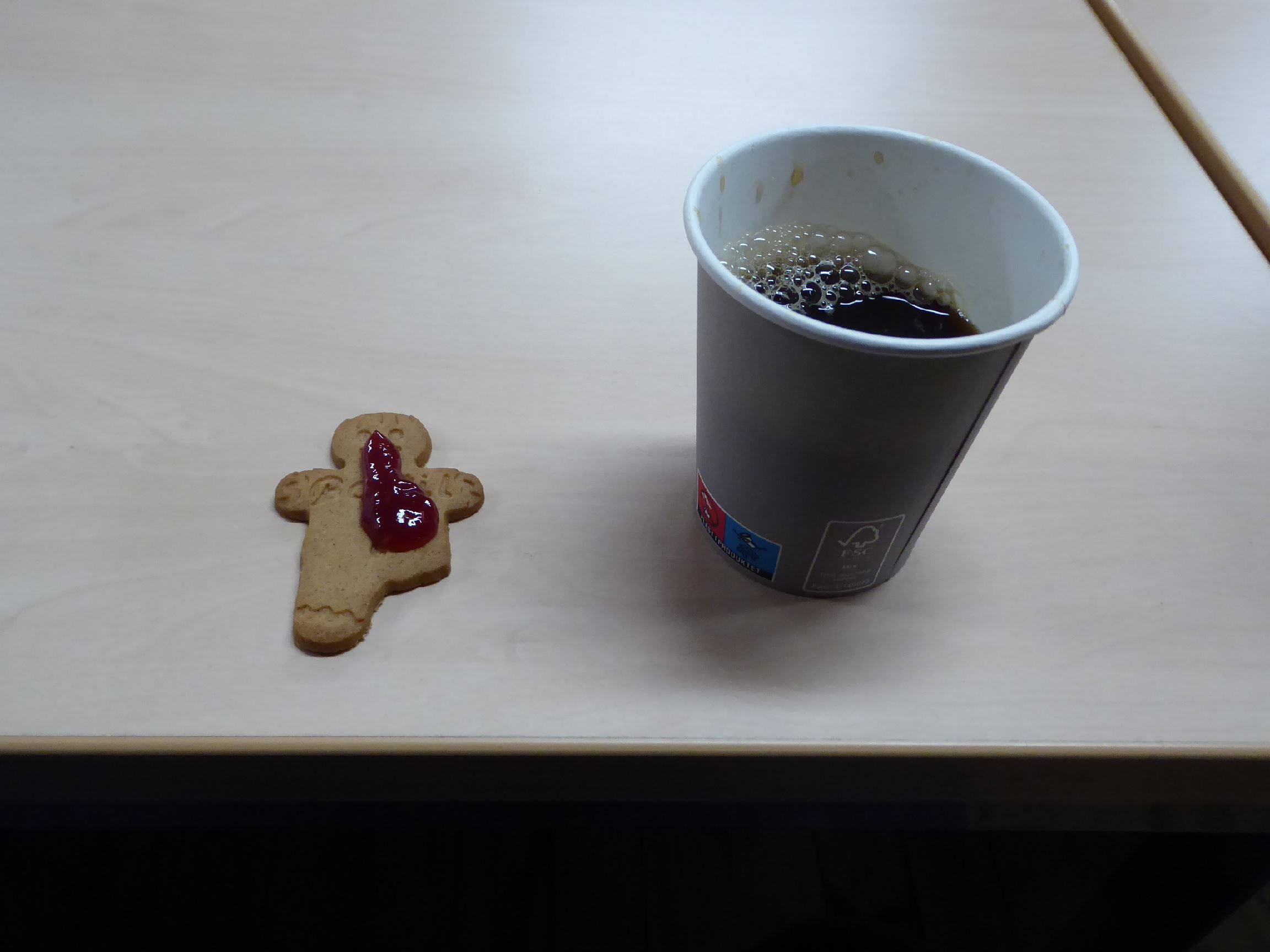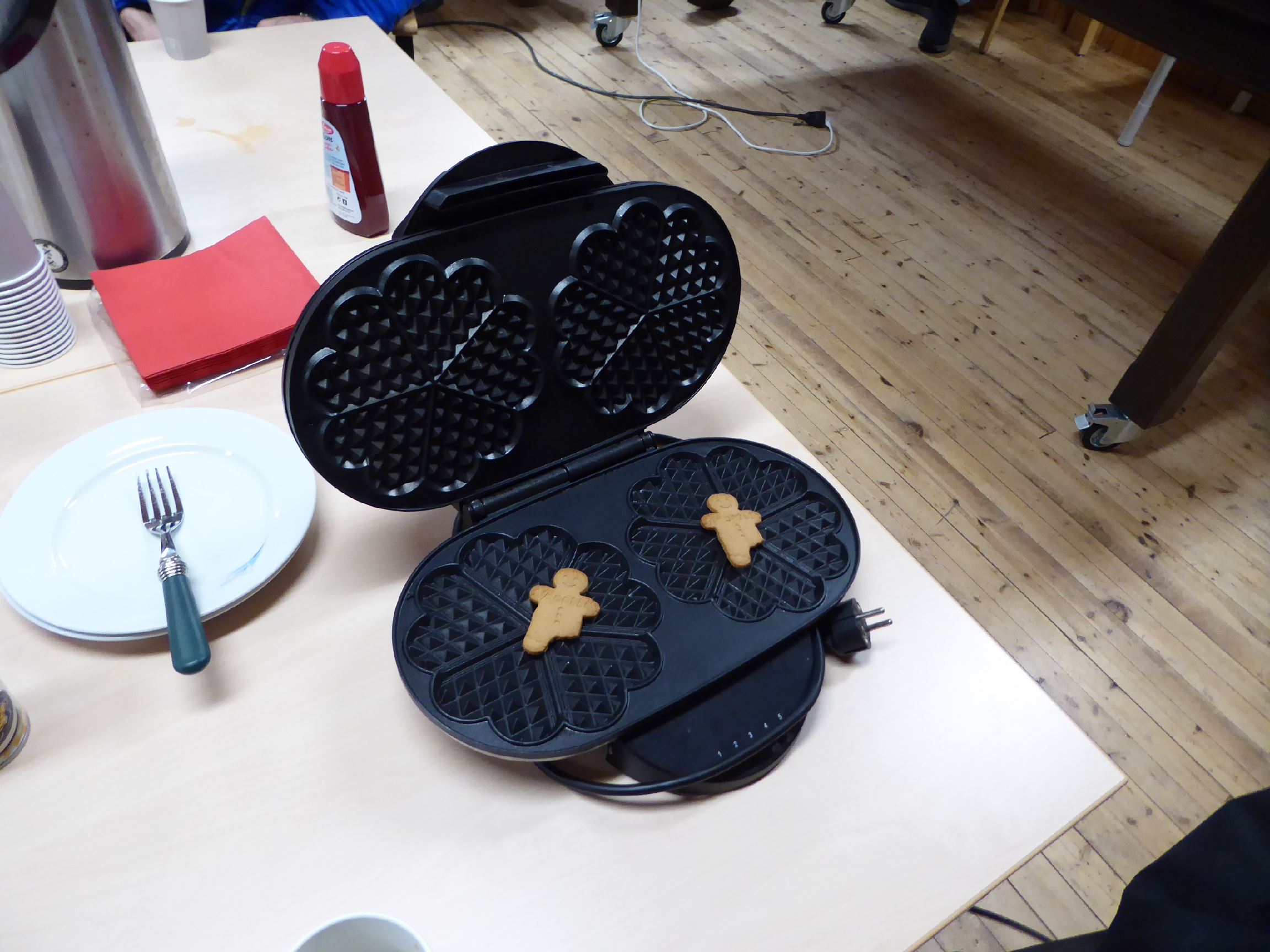 Omtrent 20 vaffelsultne sjeler hadde innfunnet seg i "Tre'ern" klokka 18 blank ikveld, og ventet tålmodig og lenge på at klubbens egen råkjører og vaffelrøre-leverandør skulle dukke opp. Til slutt måtte vi ringe til'n, men han hadde misforstått og trudde det var NESTE onsdag røra skulle leveres. Så der satt vi da, med varmt vaffeljern og tilhørende syltetøy, men uten vaffelrøre. Nå var gode råd dyre, men vi hadde en boks med amputerte pepperkakemenn og vi prøvde både å spise dem med bringebærsyltetøy og å steike dem i vaffeljernet, men det kom nok ikke opp mot de lovede nystekte vaflene. Vi må nok prøve å kvalitetsikre vaffelrøreleveransen neste gang....