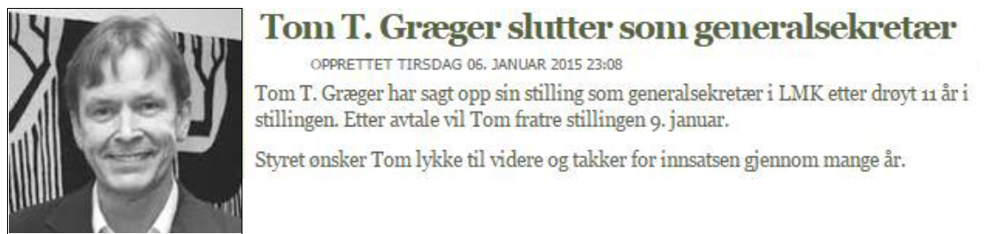 Det var første nyheten fra den kanten i 2015. Tom T Græger har vært en omstritt herremann og siste arbeidsdag blir 9. januar. Her går det unna! Nå blir det spennende å se om styret i LMK finner og kunne organisere forbundet på en annen måte. Vi følger med.