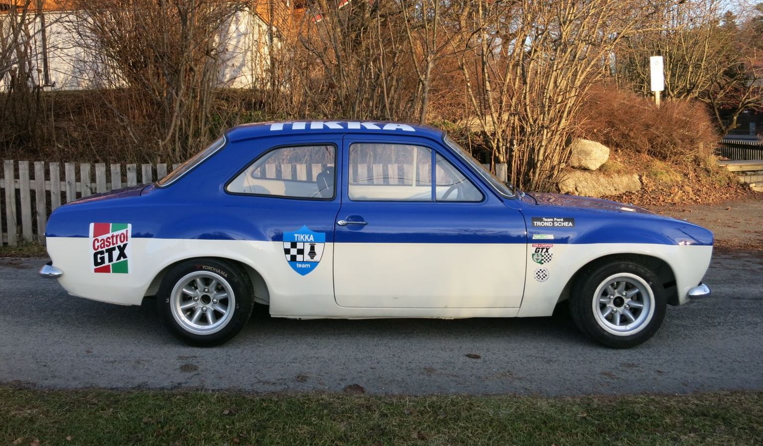 Den andre bilen i garasjen er en blå og hvit Escort Twin Cam. Denne kom til Ford Motor Norge i september 1968 og ble omgående bygget opp som en gruppe 2 banebil til Trond Schea. Hovedsponsor på Escorten var TIKKA piggen, derfor blå og hvit farge. I 1972 ble Escort homologert med en BDA 16 ventilers motor og Scheas Escort fikk en slik motor under panseret. Schea kjørte den bilen helt til 1974 og ble hans mestvinnende bil.