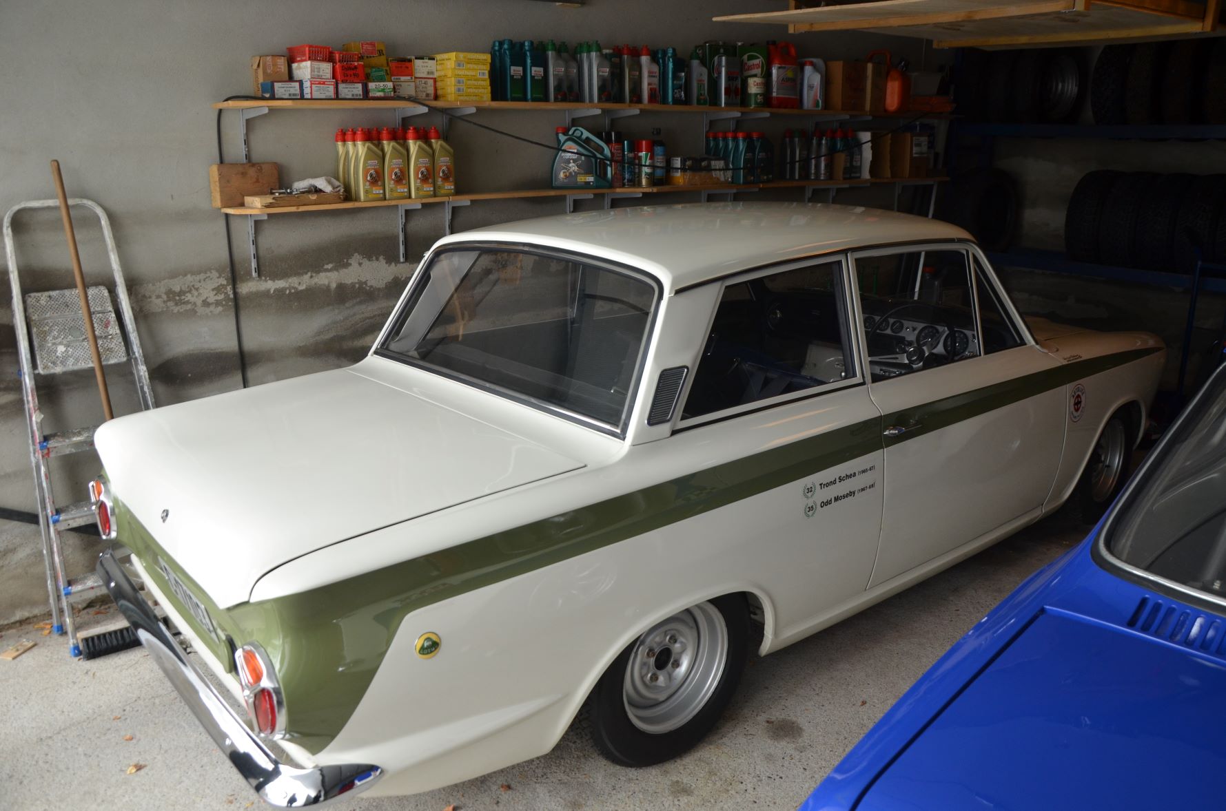 Den ene er en Lotus Cortina fra 1965. Modellen kom først i 1963. Denne bilen er en av kun 51 biler som ble ferdig håndbygget på Lotus fabrikken i England som gruppe 2 bil. Ford Motor Norge bestilte en slik bil til Trond Schea som ble levert mars 1965. Dette var etter datidens standarder en helt ekstrem løpsbil med f. eks masse karosserideler i aluminium. Bilen kom fra fabrikken med en Cosworth trimmet Twin Cam motor på 150 hk. Med en vekt på 820 kg ble dette en riktig vinnerbil noe Trond Schea beviste gang på gang med bilen frem til 1967. Deretter ble bilen overtatt av Odd Moseby. Senere flere andre eiere. Mathis fikk kjøpt bilen, eller kanskje rettere sagt det som var igjen av den i 1981 og startet på en omfattende oppbygging.