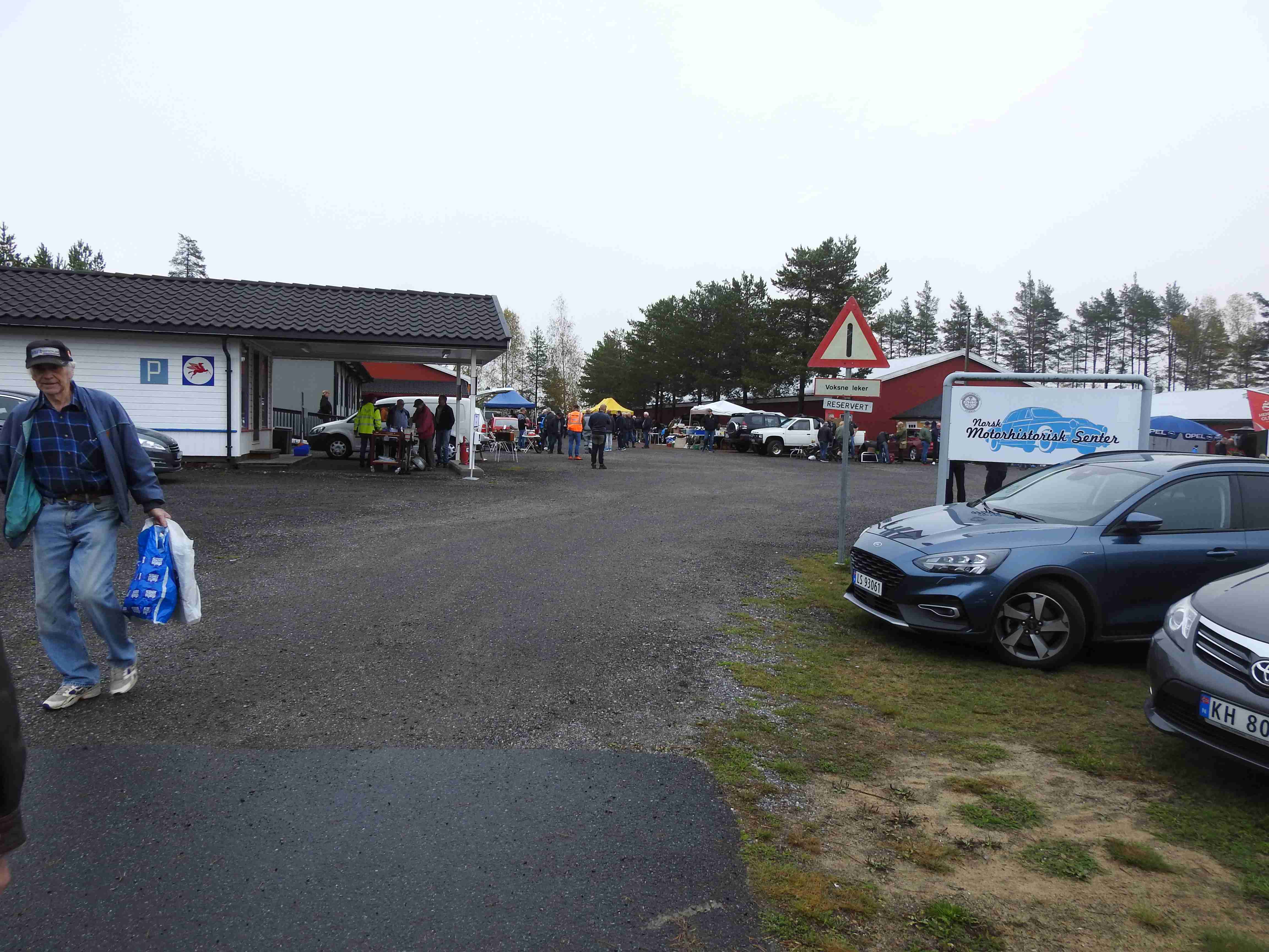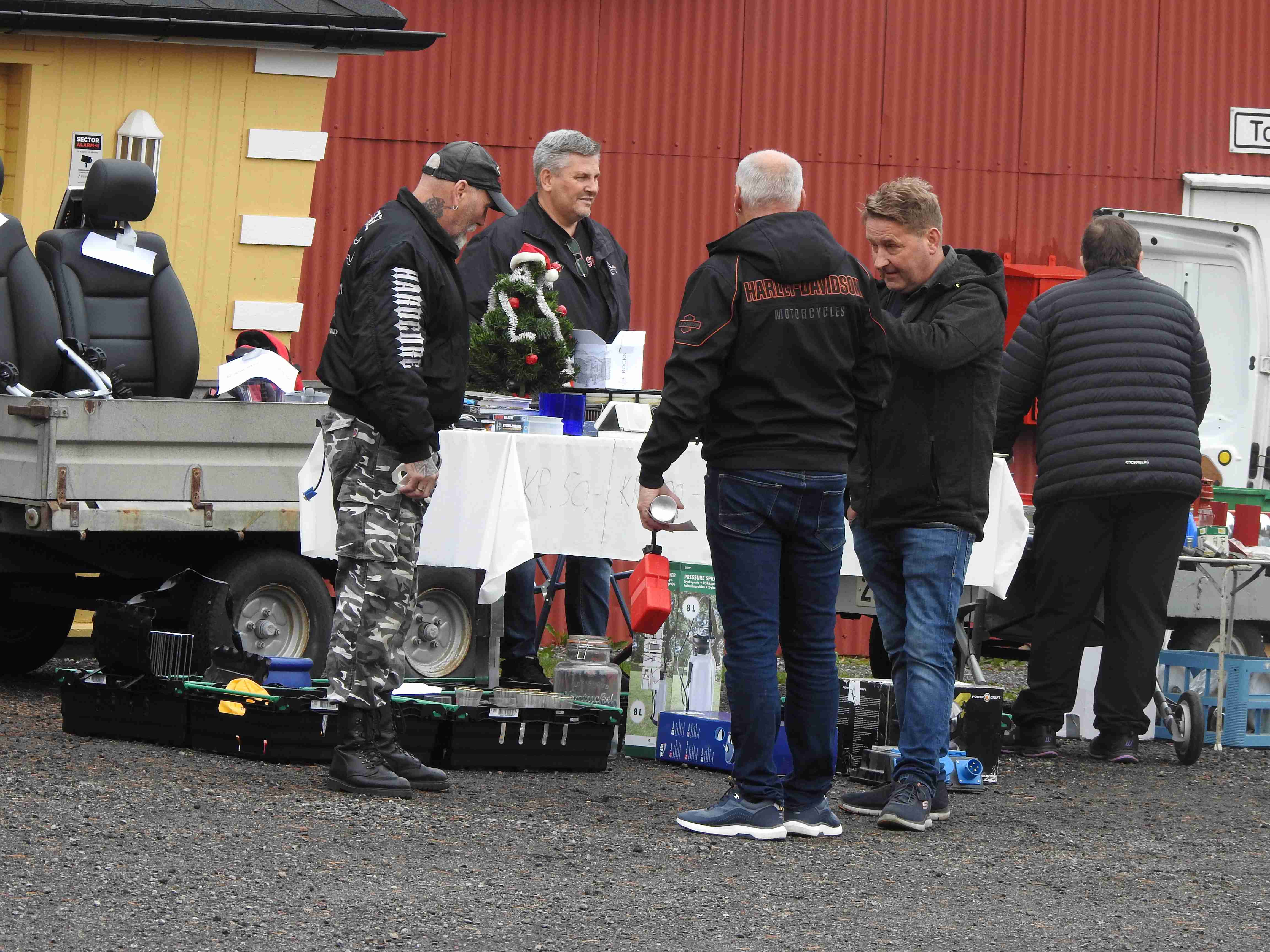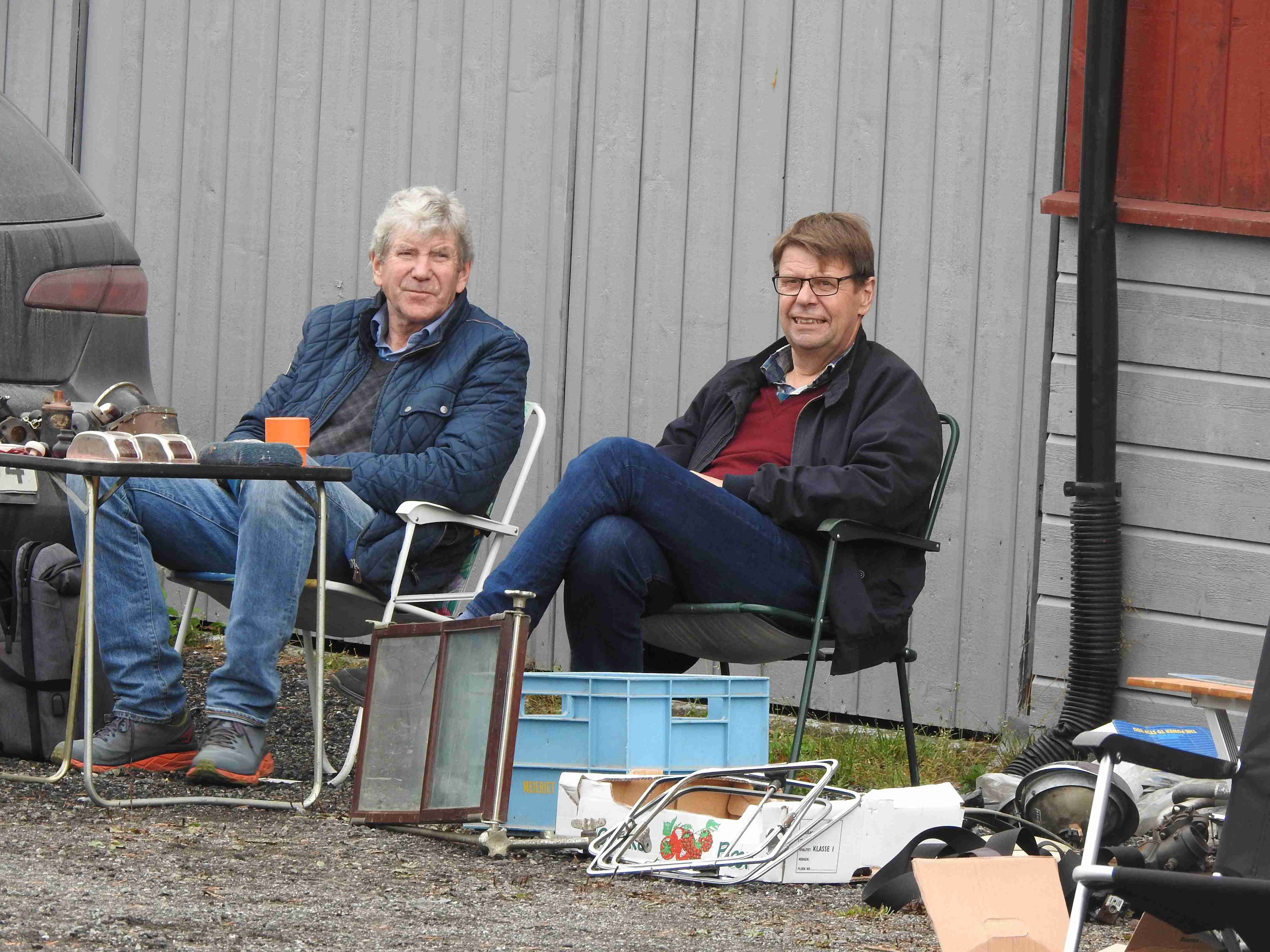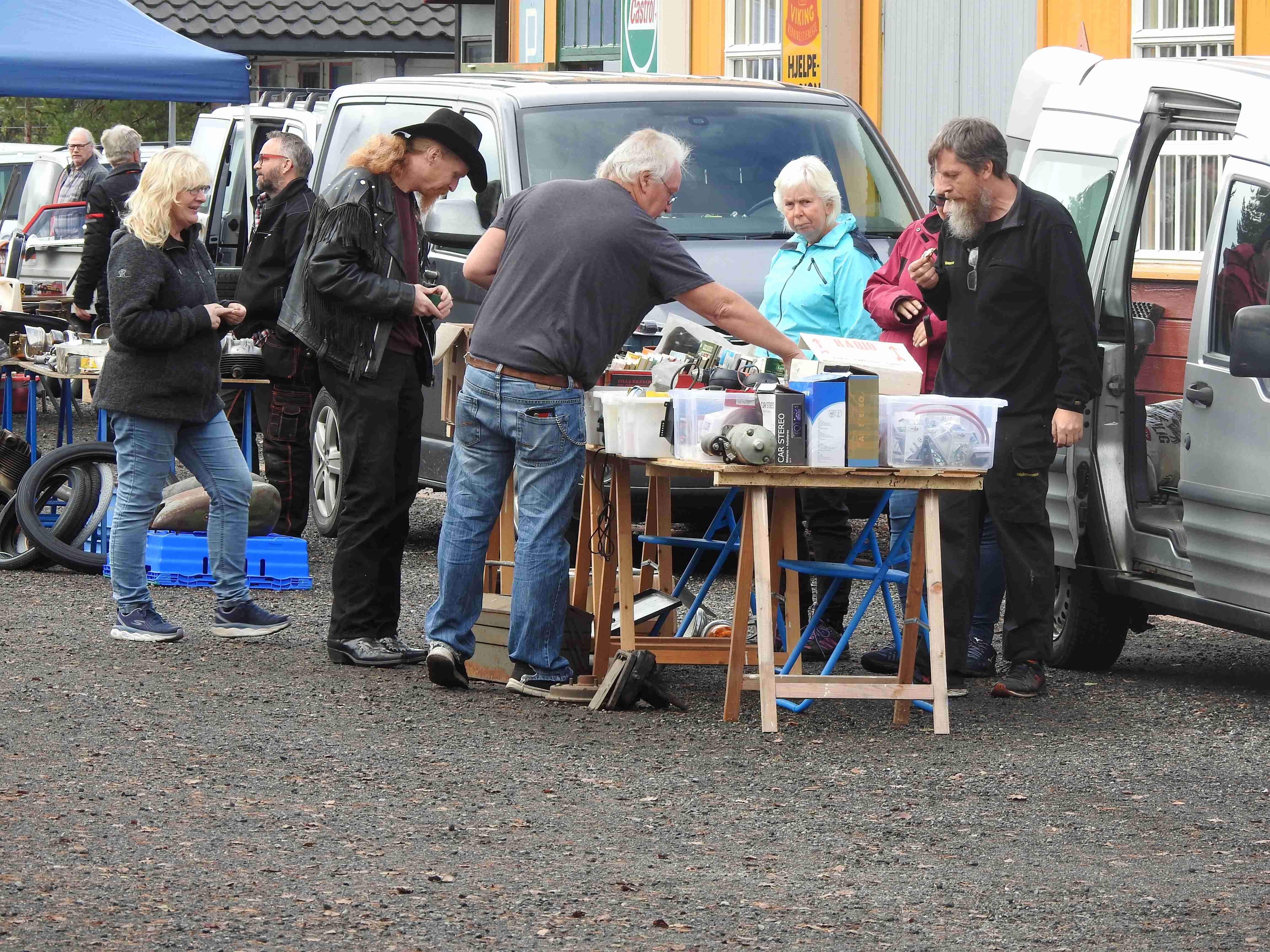 Allerede før tusmørket forsvant på denne litt disige morgenen innfant noen selgere seg. De kom i rykk og napp og uautorisert telling forteller at man hadde 42 forskjellige salgssteder innenfor portene. Som alltid er det moro å rusle rundt og kikke på hva folk har å tilby. Og tenke i sitt indre at gubbavarra så heldig en er som ikke har så mye drit. Eller gull. Det kommer an på ståsted og behov om det er det ene eller andre. Drit og møkk for noen er gull og edelstener for andre. Det kunne meldes om at handelen gikk relativt livlig hos noen, tregt hos andre. Med andre ord slik det alltid er. Hyggelig for alle var det at den store parkeringsplassen var særdeles godt benyttet.