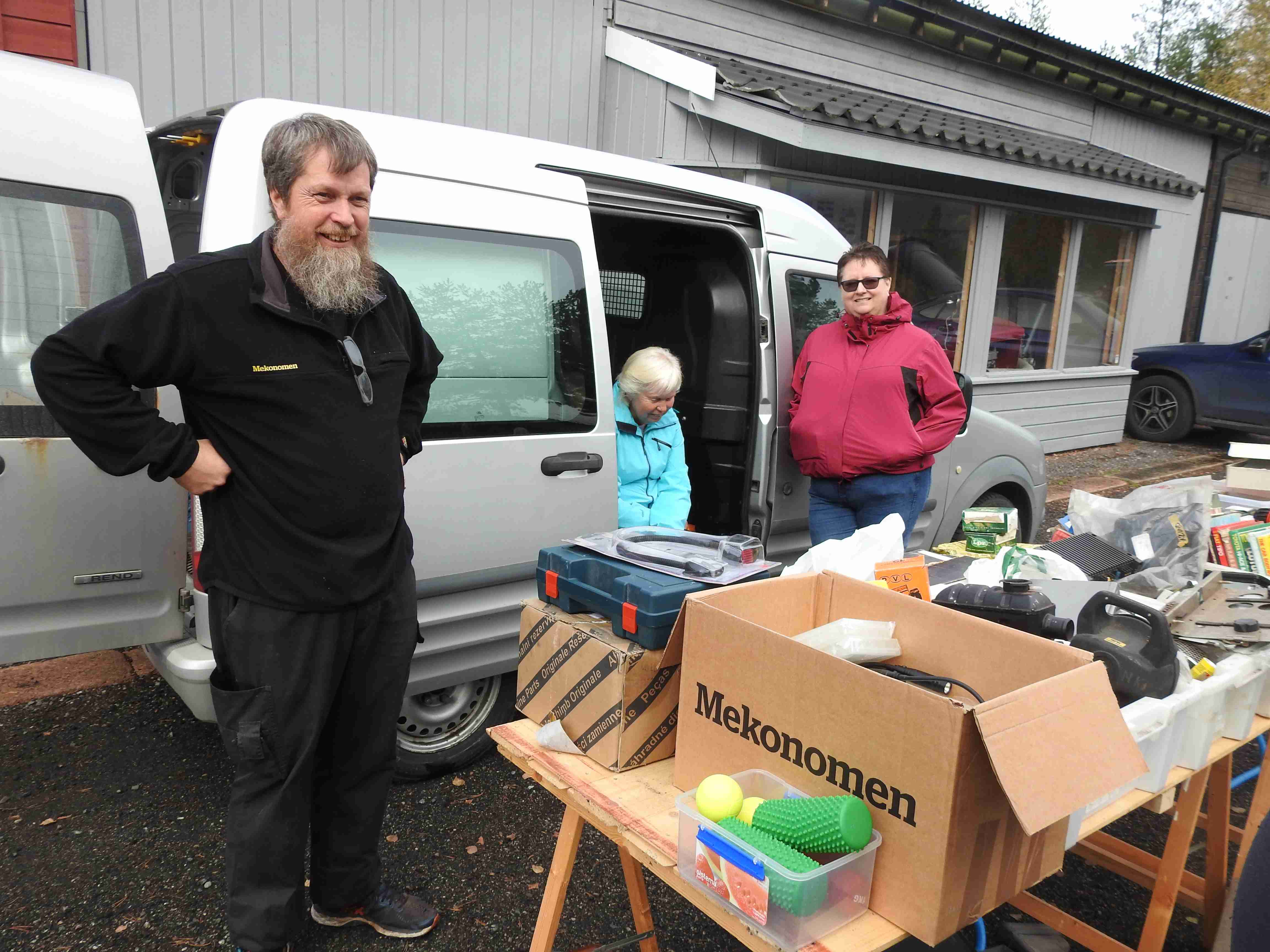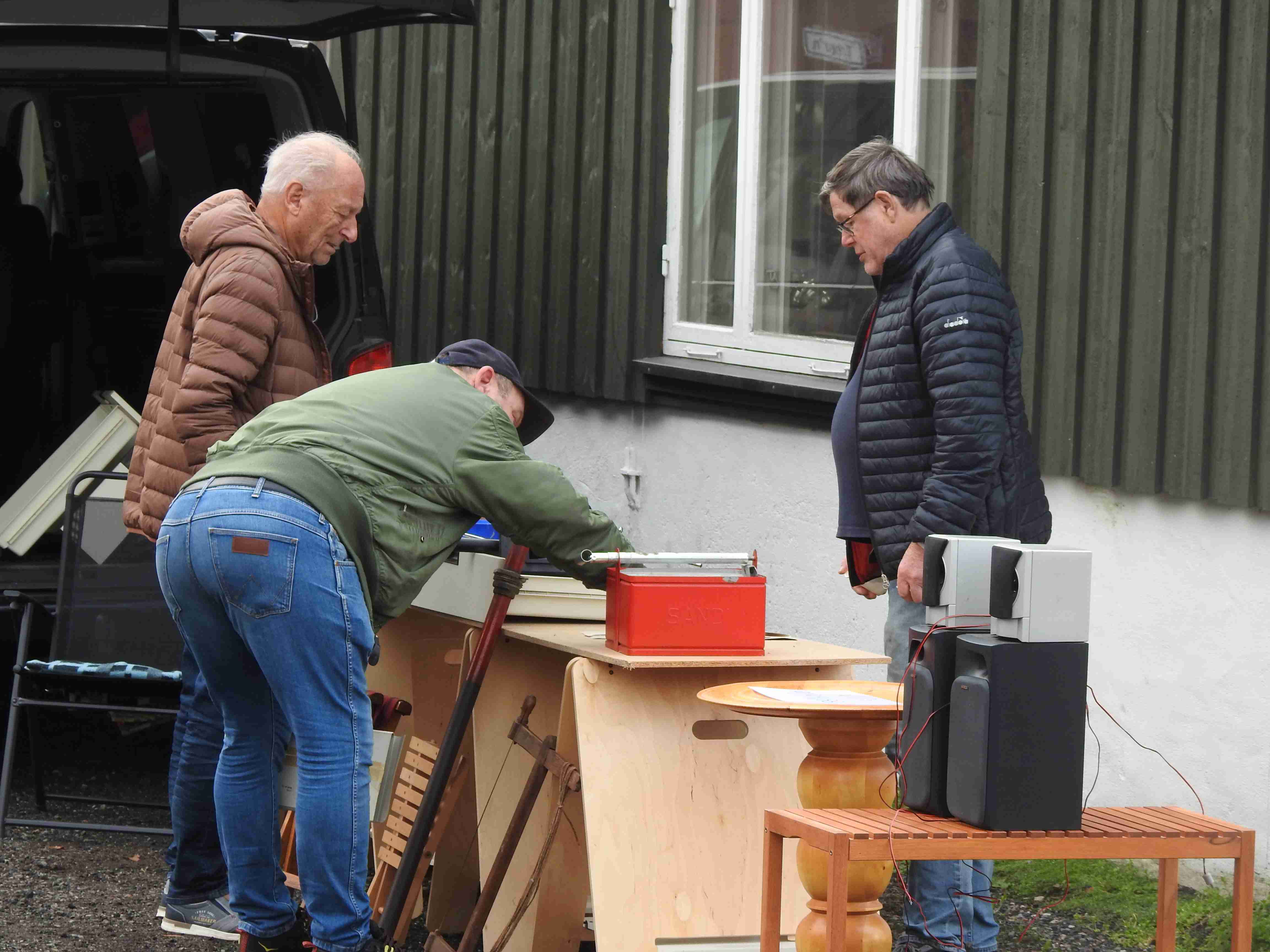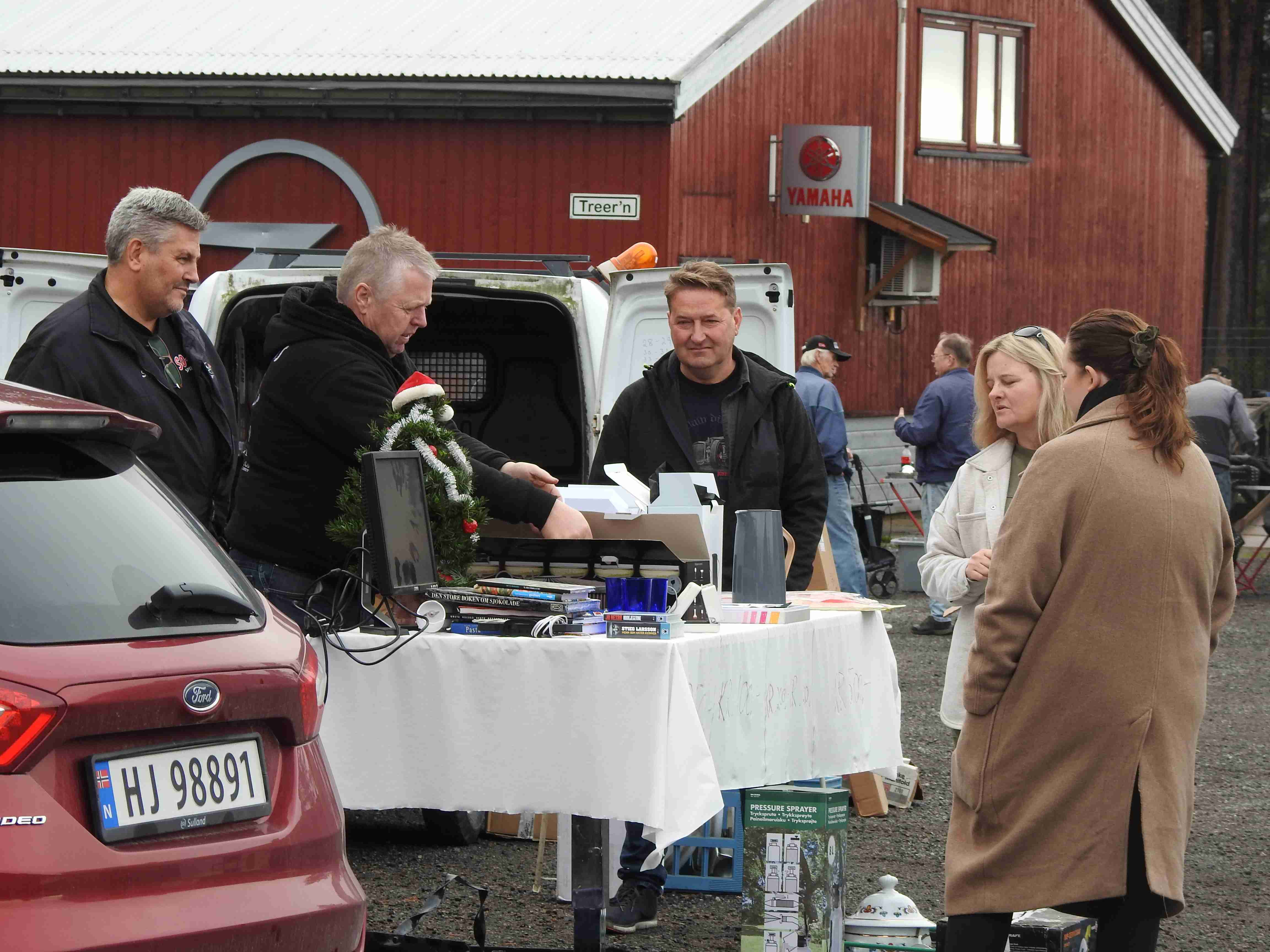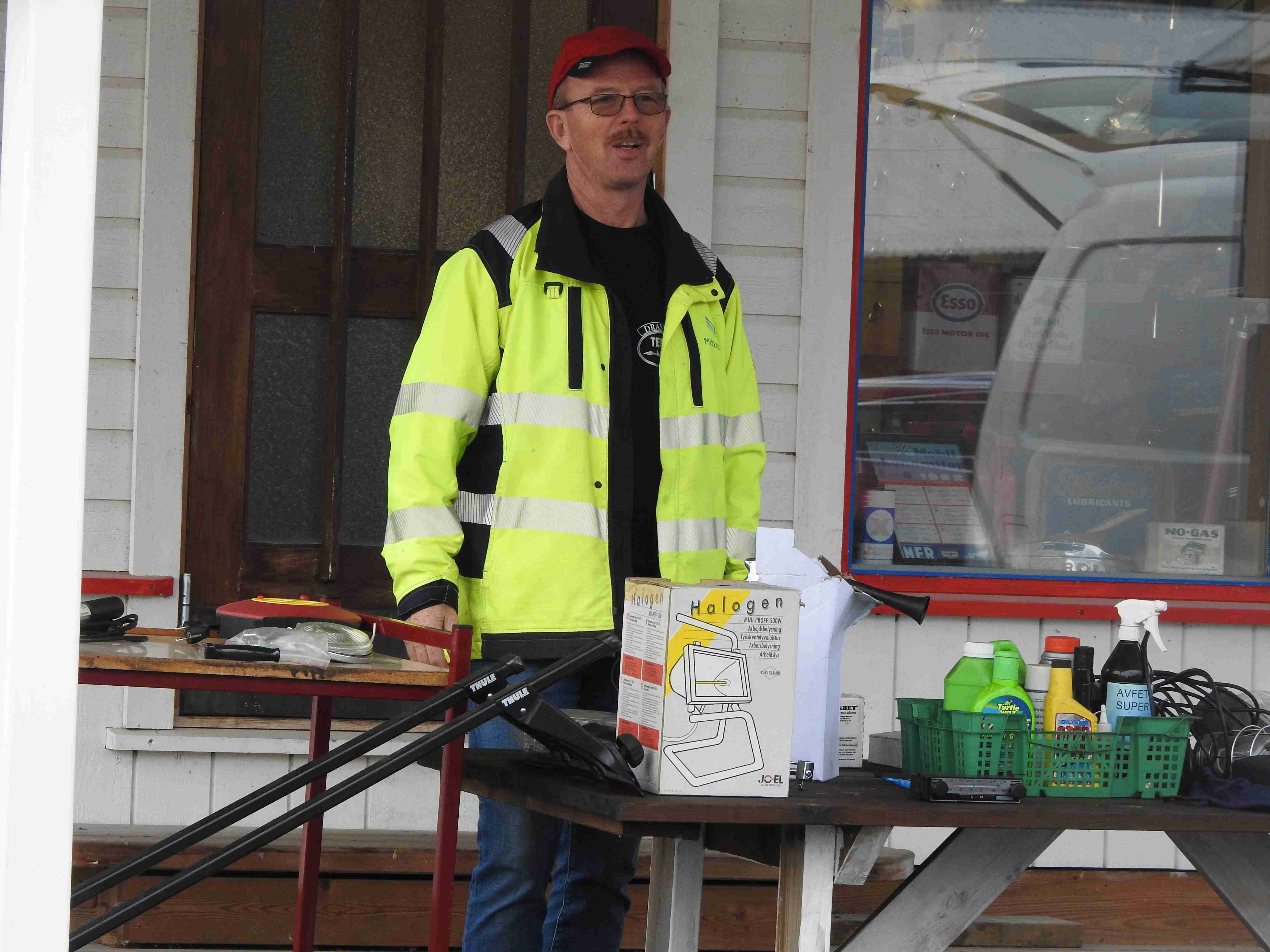 Allerede før tusmørket forsvant på denne litt disige morgenen innfant noen selgere seg. De kom i rykk og napp og uautorisert telling forteller at man hadde 42 forskjellige salgssteder innenfor portene. Som alltid er det moro å rusle rundt og kikke på hva folk har å tilby. Og tenke i sitt indre at gubbavarra så heldig en er som ikke har så mye drit. Eller gull. Det kommer an på ståsted og behov om det er det ene eller andre. Drit og møkk for noen er gull og edelstener for andre. Det kunne meldes om at handelen gikk relativt livlig hos noen, tregt hos andre. Med andre ord slik det alltid er. Hyggelig for alle var det at den store parkeringsplassen var særdeles godt benyttet.