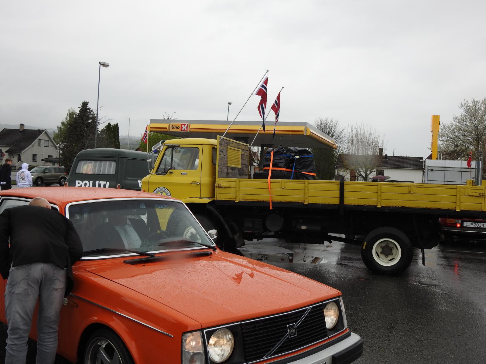 For å få ørlite stemnng hadde redaktøren fått stablet høyttalere på planet på Grisehuet (= 1975 Ford D0810). Det så ut til at publikum både ved start og langs veien satte pris på et lite innslag av korpsmusikk. Det hører jo syttende mai til. Som takk for bryderiet ble vi under oppriggingen frastjålet en kliss ny mikrofon vi hadde lånt. NB: Før vi kom til Eikersenteret. Intet får man ha i fred - vi må selvsagt erstatte det tapte. Takk til Kjell og Espen Nilsen, Ski og Ballklubben Dravn og Sivilforsvaret for utlån av materiell og musikalsk konsulenttjeneste. Og takk til Steinar Ludvigsen som sto bak hele opplegget. Det var ikke et arrangement - det er nemlig forbudt!!!