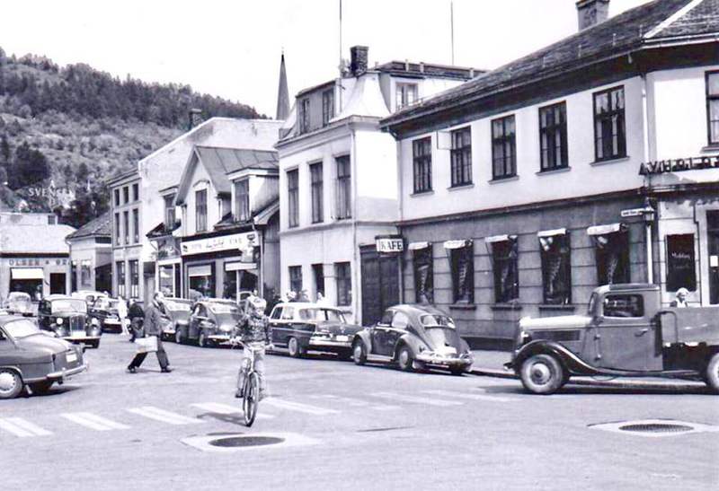 Det kan neppe bety noe annet når to eksemplarer av spesialavfallsproduktet Volvo står etter hinannen. Stakkaren som kjører den første sleper nok på delebilen sin. Ellers er bildet fra Sankt Olavsgate i Drammen et godt tidsbilde. Foruten de to nevnte Volvo PV ser vi en Opel Super Six på vei nedover gata, mens et knippe Folkevogner og et par Mercedeser står parkert med beste samvittighet uten å ha brukt parkeringsapp. Eller parkometer. Dette var nok lenge før yrket parkeringsvakt var oppfunnet. Ut fra Øvre Torggate kommer en 1937 Ford med norsk hytte. Bak bilen ligger Avholdshospitset. I det bygget er det mange år siden det har vært noe som har minnet det aller minste om avhold. Dickens Pub råder grunnen nå. Ellers ser vi rompa på en Skoda 440 og en snørrunge på sykkel. Uten hjelm. Koselig bilde.
