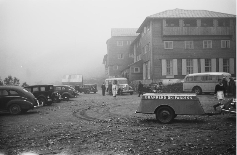 Vi har tidligere sett Guldlistefabrikkens selger på tur i Ålesund. Her er det salgsfolket hos Drammens Skifabrikk som er på markedsføringstur. Må vi anta. Er det selgeren vi ser ulastelig antrukket i shorts, sportsgenser og gummistøvler? I et skikkelig ufyselig vær ved Fossli Hotell på toppen av Vøringsfossen. Trekkvogna er kanskje en Chrysler, bussen er en Dodge og ved siden står en liten Opel Cabriocoach. Vi ser også en Strømmen-Dodge i det fjerne og rompa på en Ford V8. Og litt av hvert annet.