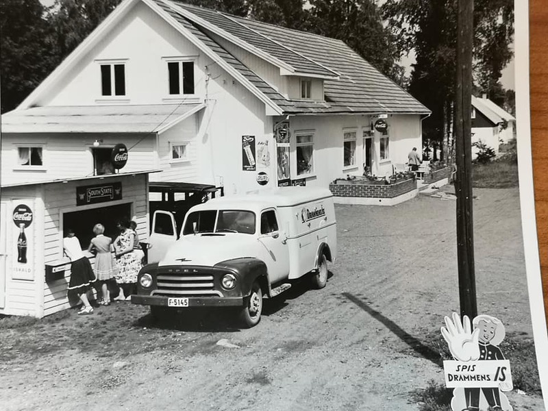 For noen få år siden var det ingen som gadd snu seg etter et gammalt påbygg for transport av is. Men nå, tenk om man nå hadde hatt denne 1955 Opel Blitz med det fine påbygget. Sikkert ikke noe aggregat i dette, heller stappfullt av tørris. Bilen var registrert på Drammens Iskremfabrikk - eller Drammens Is som vi kjenner bedriften som. Bildet er tatt utenfor den kjente Flykafeen på Barkåker. Hvem har et South State-skilt å gi bort? Et slikt skulle vi absolutt hatt på kiosken vår. Går fint med et annet merke også.......