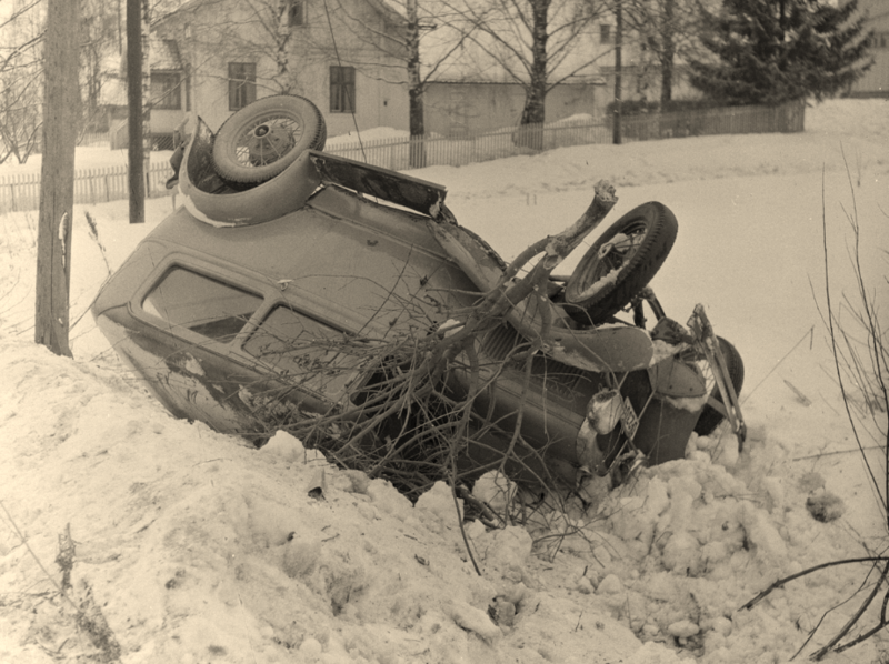 Dette bildet er som et apropos til dagens kaos på veiene. Det gikk ikke alltid bra før heller. Å kjøre A-Ford på blankslitte sommerdekk var nok til tider ulidelig spennende. For karen fra Hamar-kanten - tar det som en selvfølge at det var en kar - gikk det gæli, men han fikk nå ordna seg med litt ved om ikke annet. Hadde han vært fra Modum eller Sigdal denne uheldige sjåføren hadde han kanskje ropt 'huen tute' av full hals. Huen var et annet navn på en fyr vi støtt påkaller. Mer vanlig kalt faen. Vi som er lokalhistorisk interesserte bør jo banne med velvalgte gamle ord, så herved oppfordres det til å skrike 'huen' eller 'hinmannen ta deg' når sterkt sinne og langvarige frustrasjoner skal utløses offentlig. Løkke te.