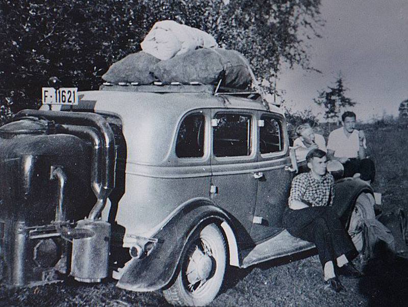 Dette bildet som er tatt under krigen eller umiddelbart etter forteller mye om hvor enkelt alt er i dag. Vi ser Kristian Ellingsen fra Sysle med det som må være en canadisk Ford. Aner ikke når europallen ble oppfunnet, men det kan se ut som gutta på bildet har laget en variant. Brukt som takgring og elegant planta rett oppå pergamoidtaket. På forhånd av turen har gutta vært på skauen og høgd ved. Gjerne or, og produsert knott til drift av generatoren. Et par sekker drivstoff ligger sammen med teltet på biltaket. Svær brenner bak produserte gass. Såpass dau ble motoren ofte at passasjerene måtte ut og dytte i motbakkene. Eller det ble forsøkt med rygging fordi reversen ofte var litt lavere gira enn første gir. Et godt tidsbilde dette her.