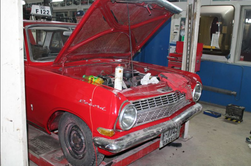 23.09.14 Bilen går! Otto har byttet regreim, Erik og Atle har fiksa bremser og det er konstatert at automatkassa trekker bilen i begge retninger. Noen aha-opplevelser får vi også - håndbrekk har ikke konstruktørene brydd seg med å lage, ei heller har de sett noen nytte av sikkerhetsbelter. Her må vi nok modernisere litt før vi kan registrere.