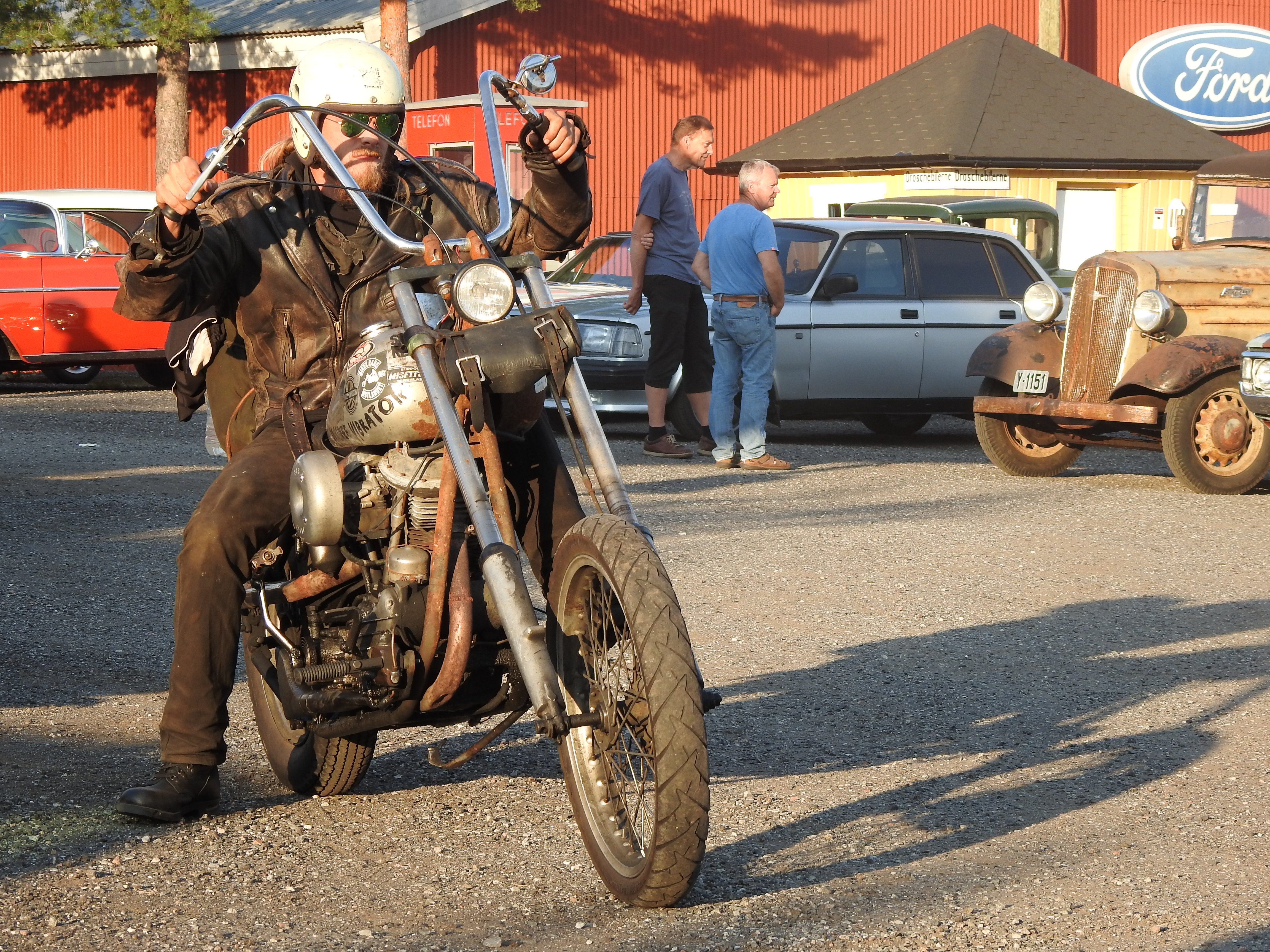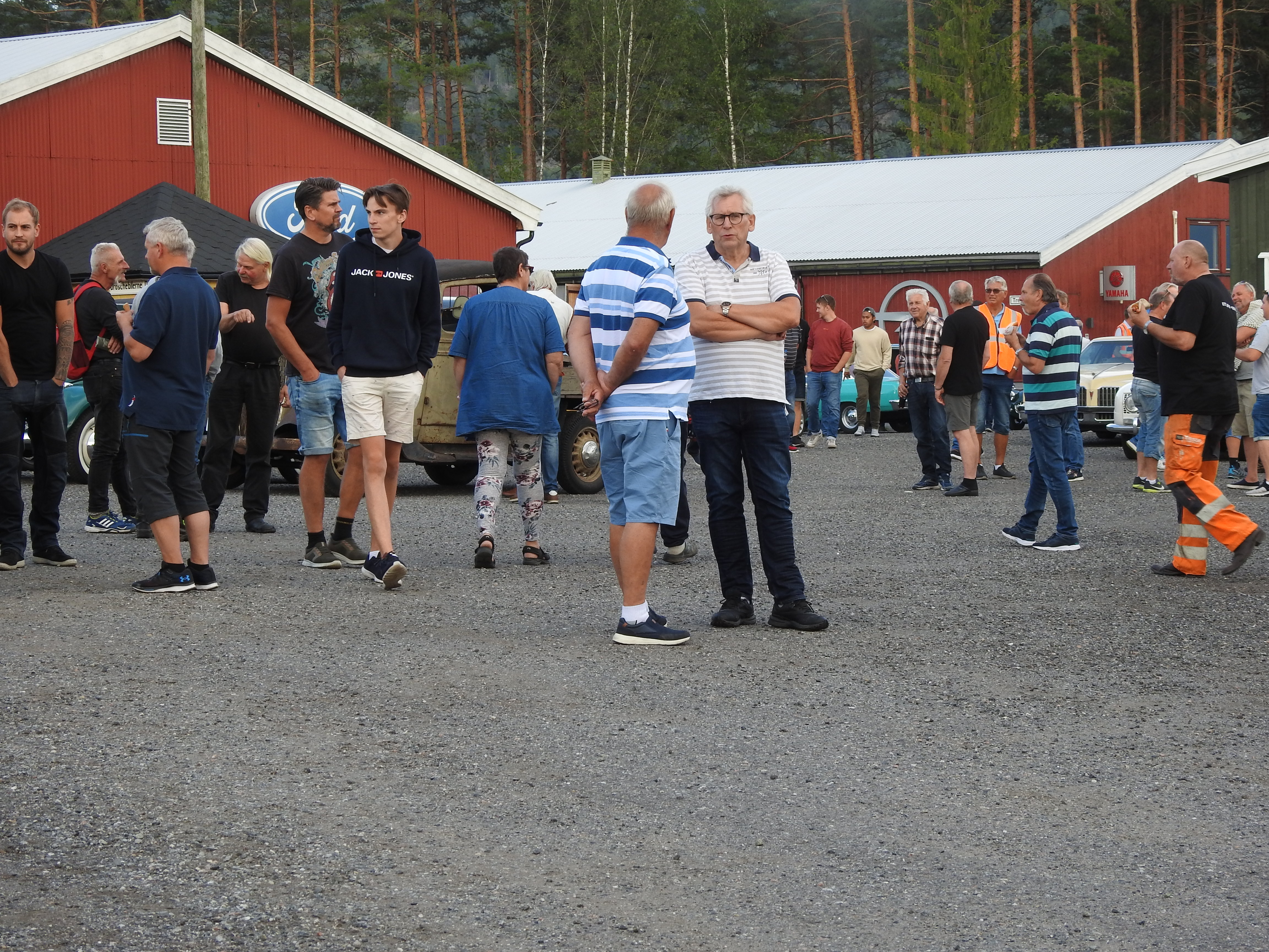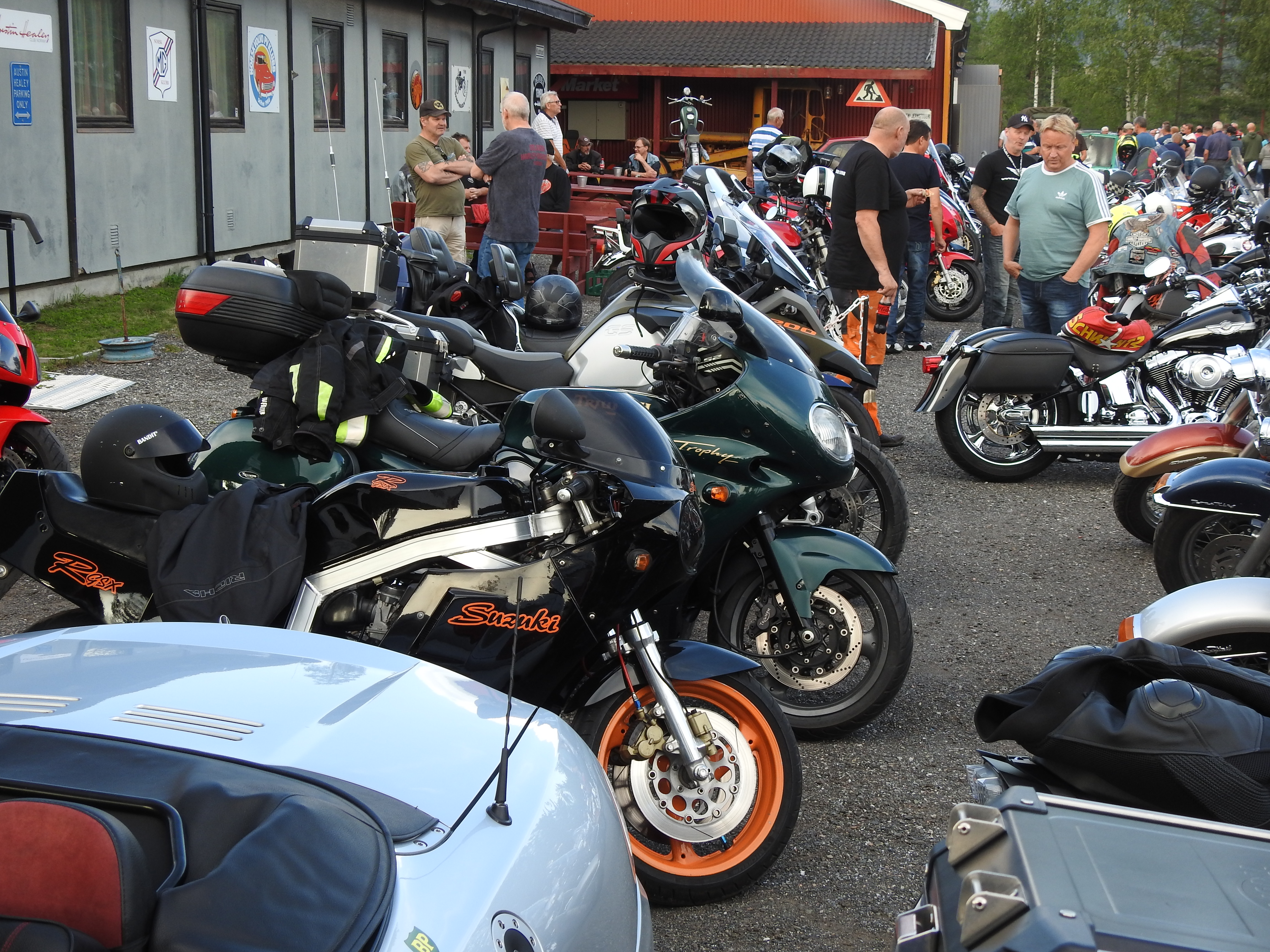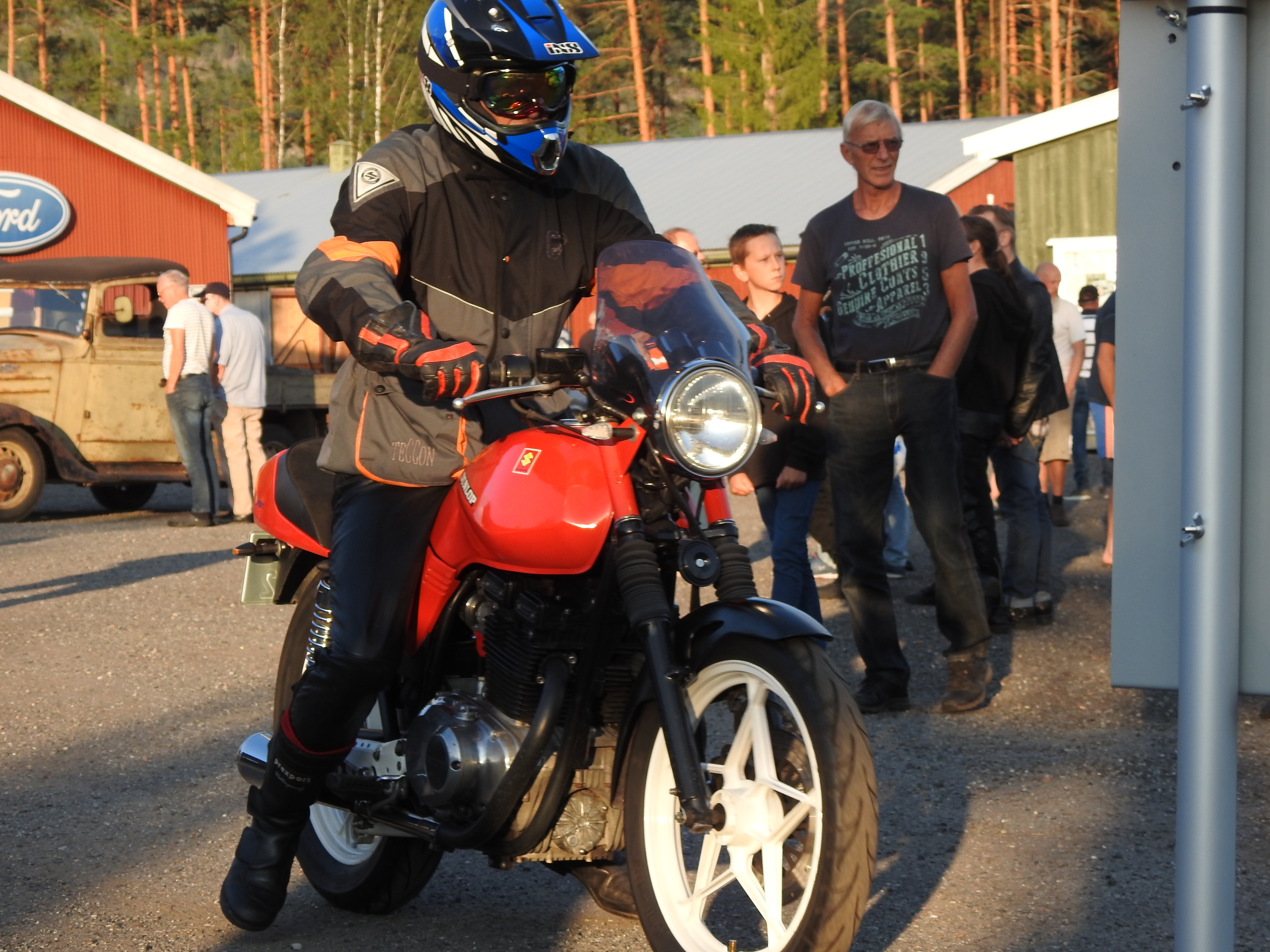 Masse gamle kjente og masse nye folk og kjøretøyer. Vi fikk se alt fra moped til militær lastebil. Den som gjorde mest inntrykk var en kar som kjørte gammel Harley uten fjæring bak. Han hadde ikke sete heller, satt rett på bakskjermen. Neppe noen nytelse, men småtøft var det.