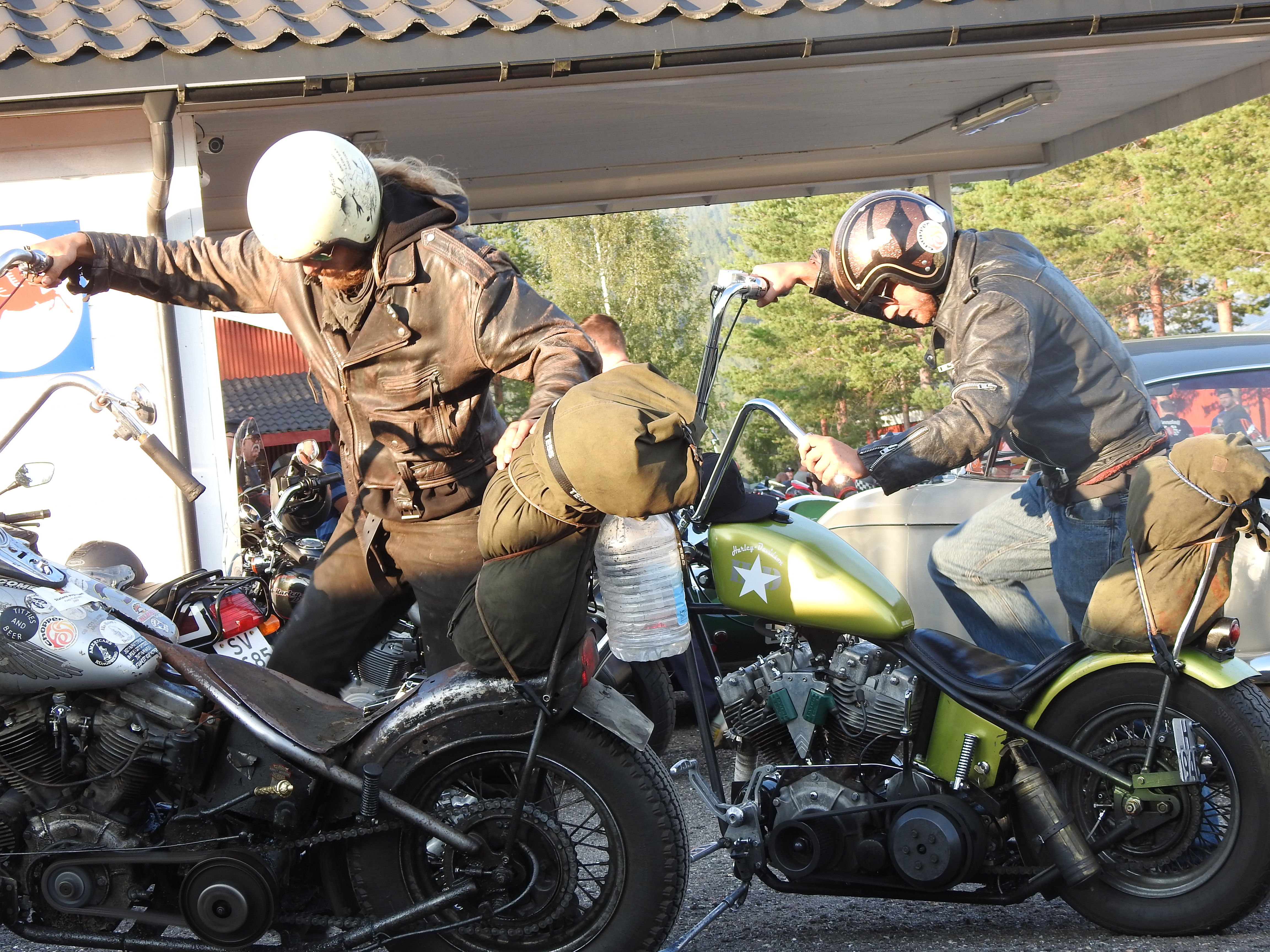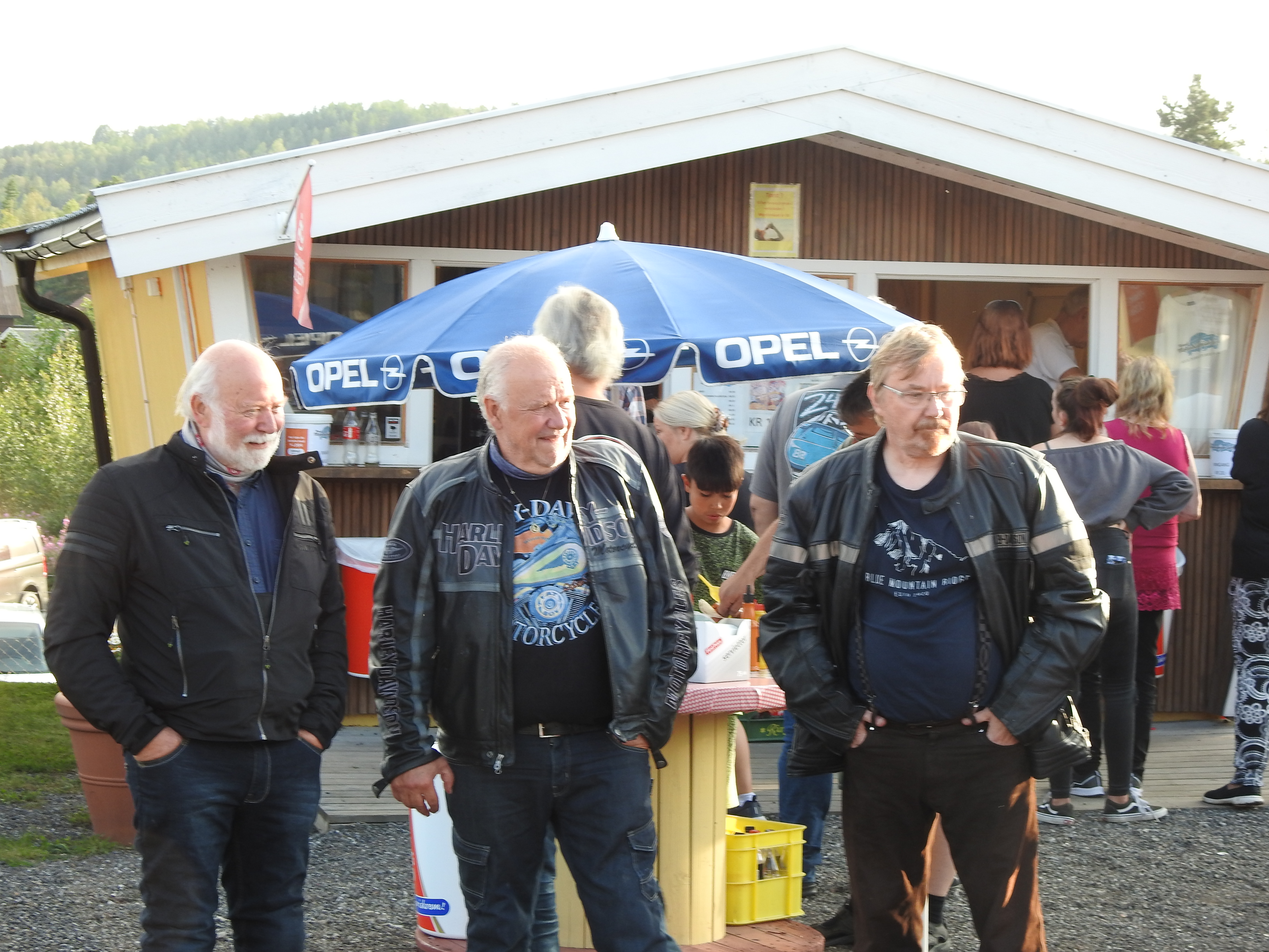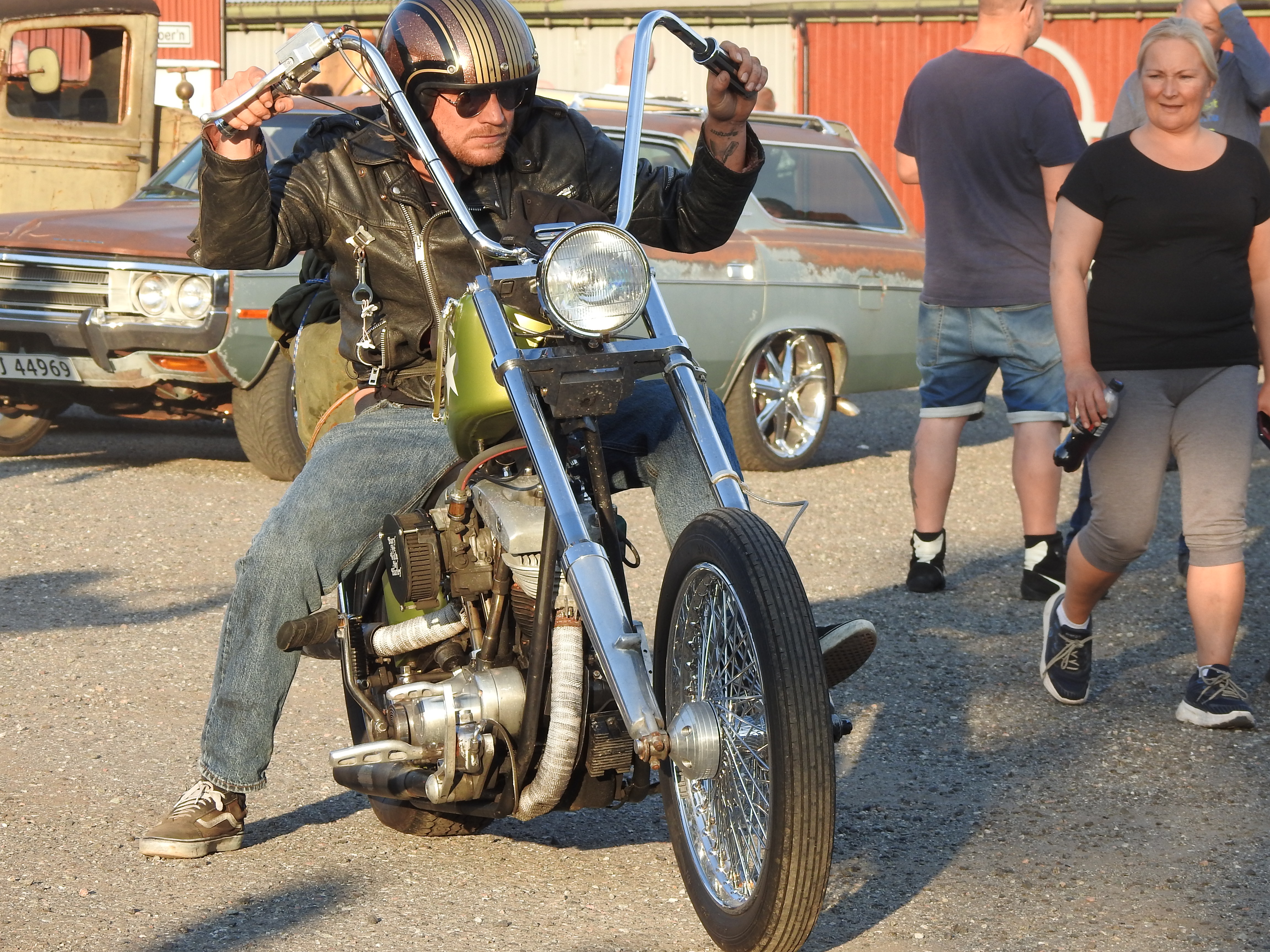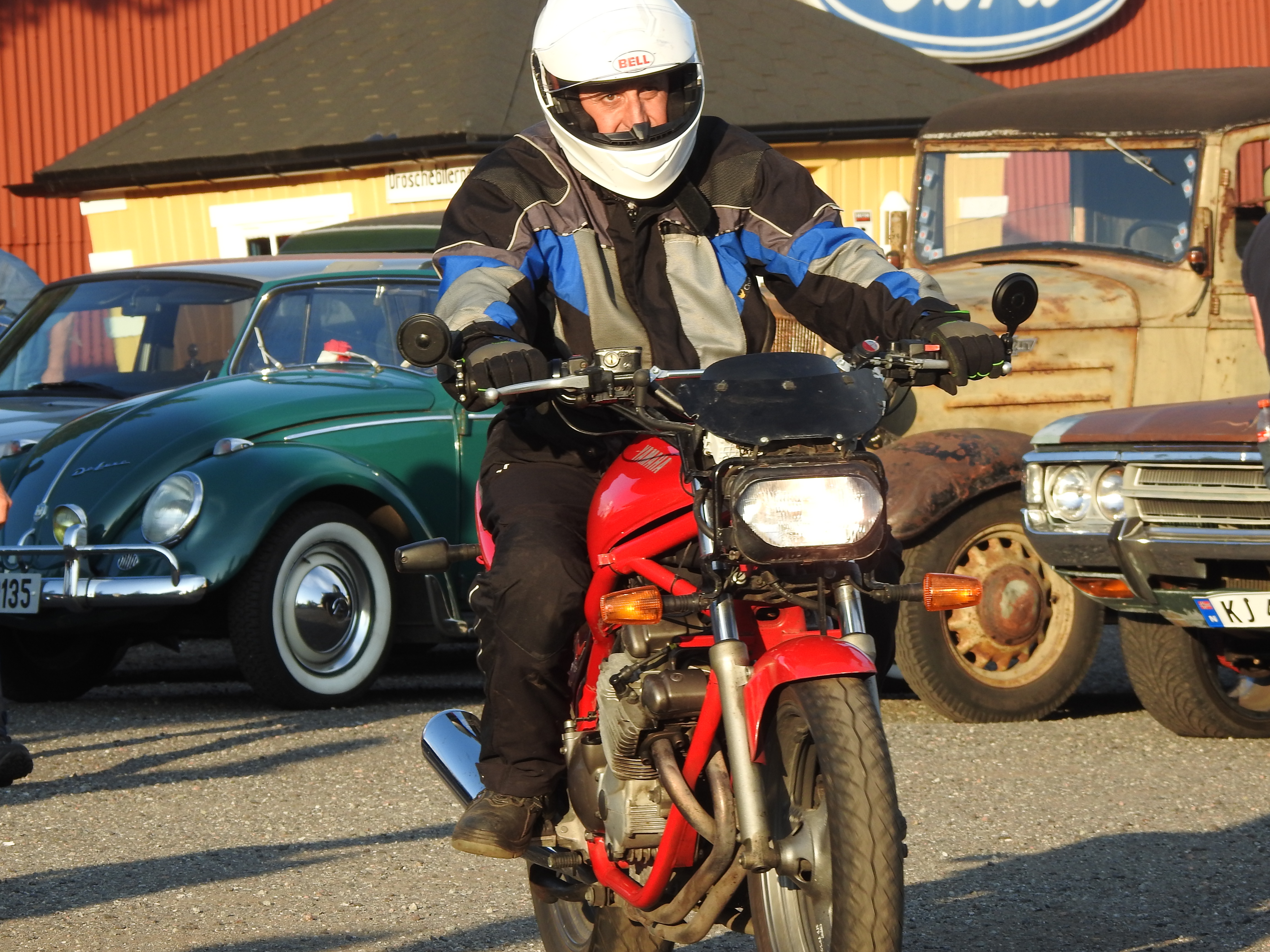 Masse gamle kjente og masse nye folk og kjøretøyer. Vi fikk se alt fra moped til militær lastebil. Den som gjorde mest inntrykk var en kar som kjørte gammel Harley uten fjæring bak. Han hadde ikke sete heller, satt rett på bakskjermen. Neppe noen nytelse, men småtøft var det.