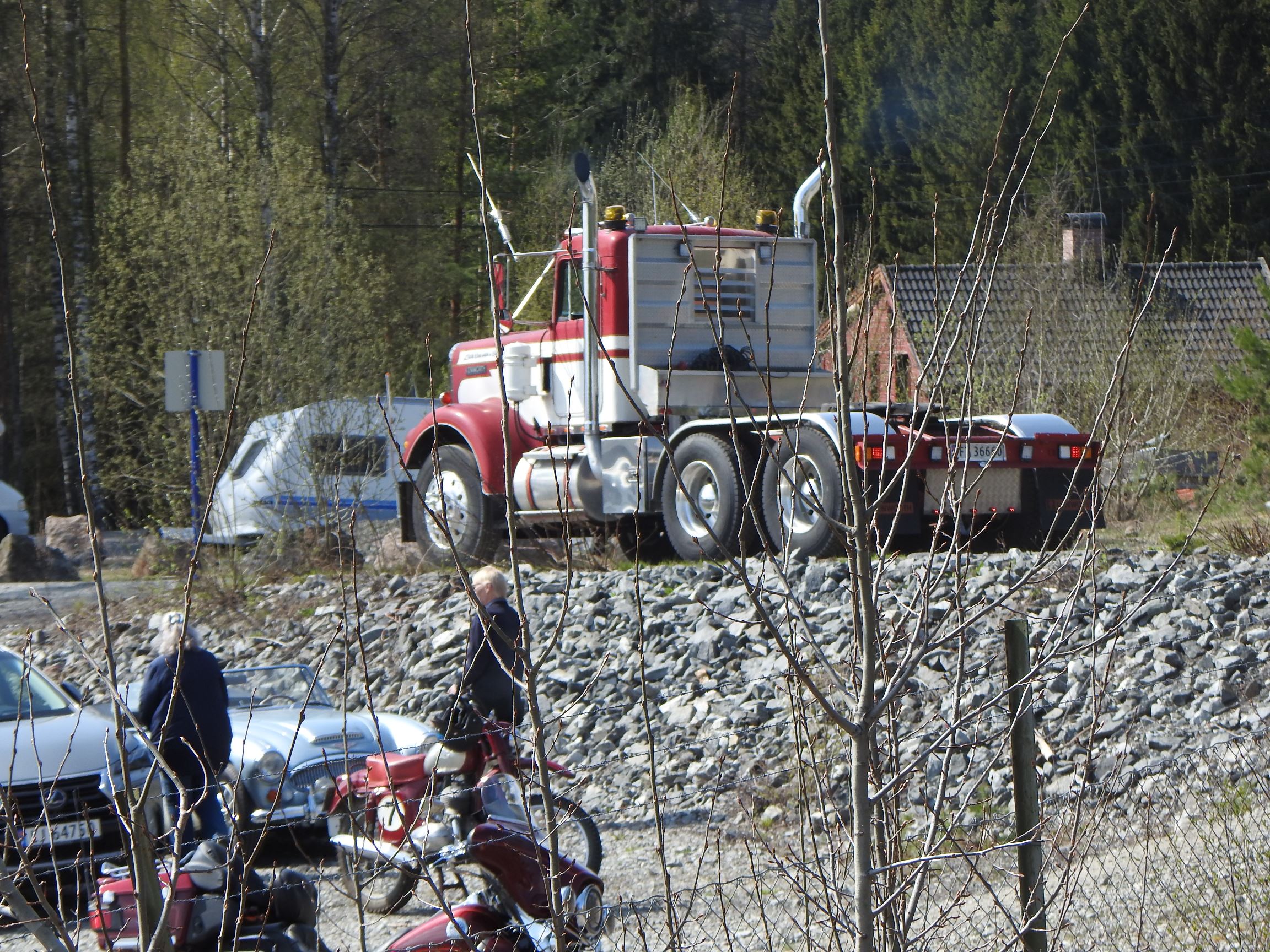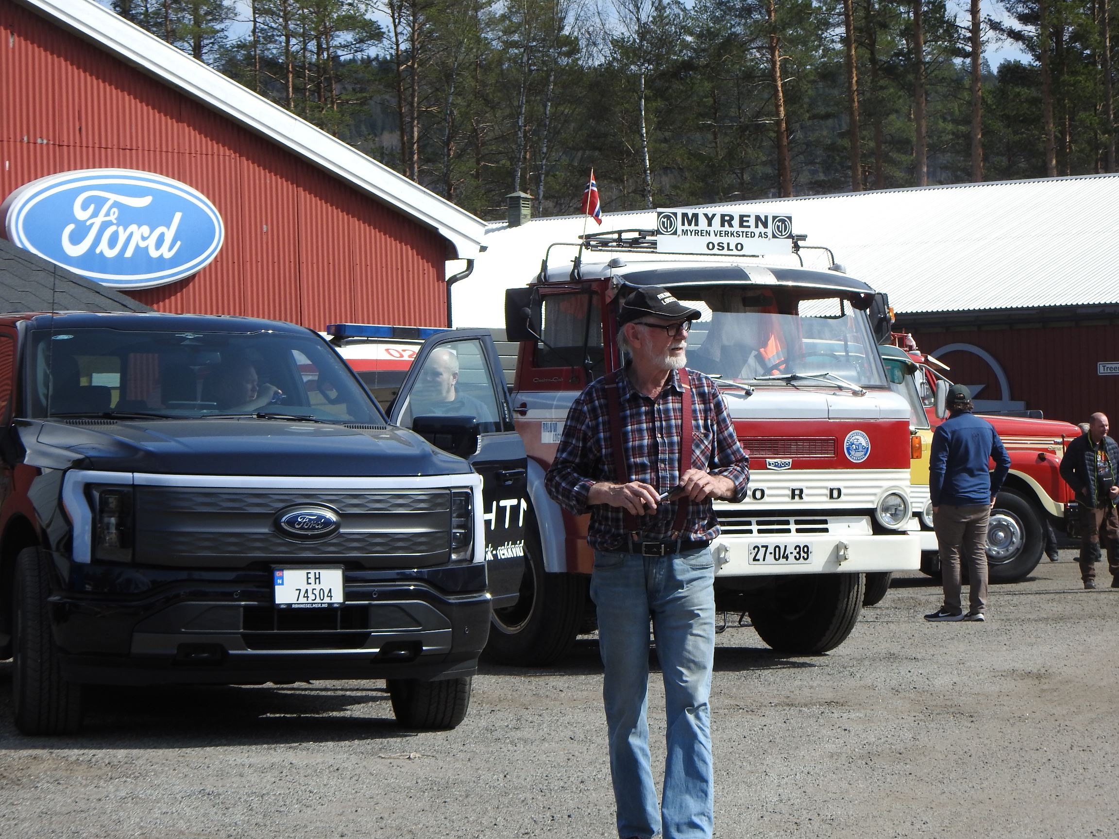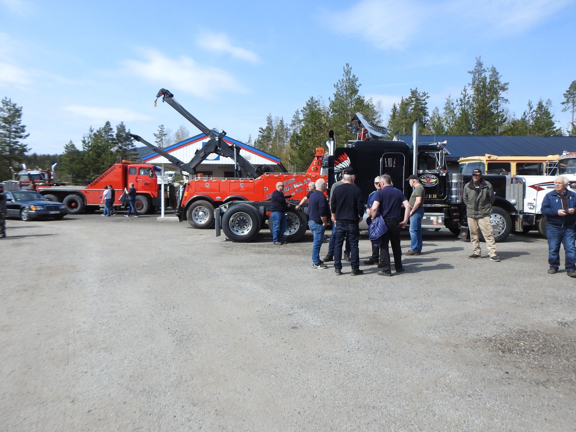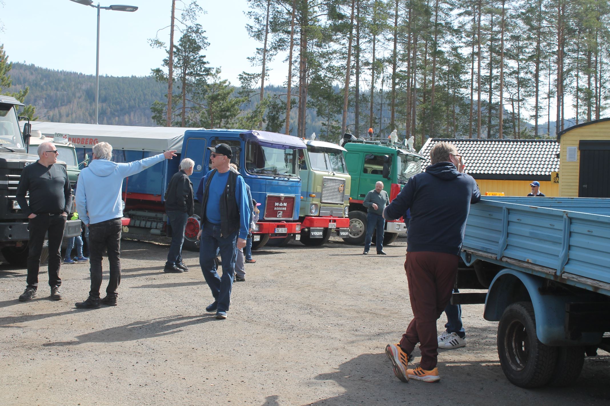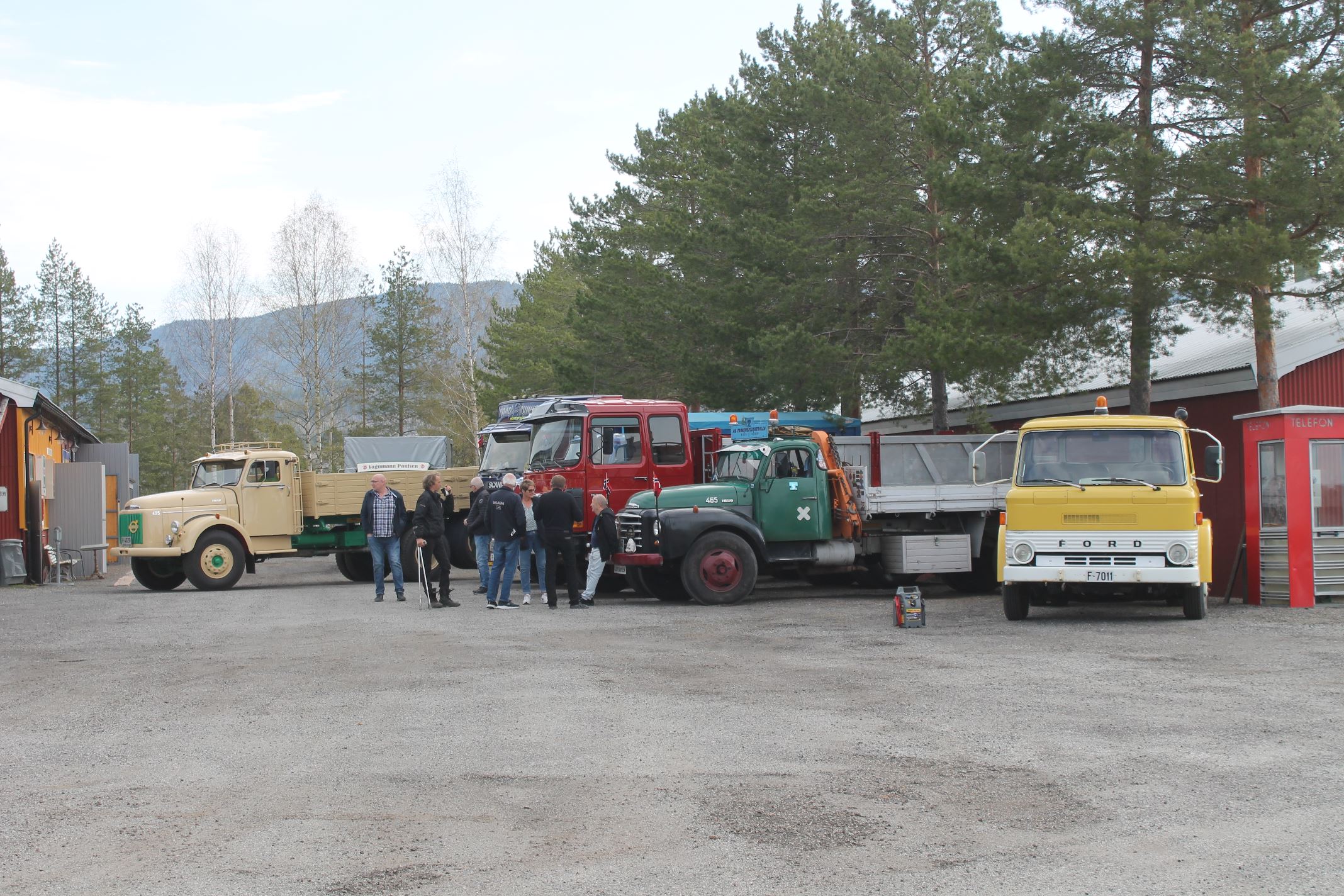 Dagen opprant med perfekt vær og det begynte å strømme på sakte, men sikkert en god stund før offisiell åpningstid. Som vanlig mye Volvo og Scania i alle mulige variasjoner, en god ladning med Mercedes, MAN og Ford og noen Folkevogner ispedd mer sjeldne fugler som trehjuls Tempo, pedaldrevet Paulsen-cycle, Steyr, Magirus, Studebaker, Willys og Renault. Treffets eneste tilreisende buss var også eneste DAF. En eneste førkrigs bil var skuffende alene, men Chevrolet’en fra midt på trettitallet hadde selskap av en slektning fra det første etterkrigsåret. Alltid er det imponerende å se uoversiktlige amerikanske lastebiler med akselavstand lik verdensrekorden i tresteg og med sving som en agurk med EU-standard, imponerende å se hvordan de blir håndtert under trange forhold. I fall det skulle oppstå vanskelige situasjoner var det selvsagt både politibil og ambulanse på plass. Og ikke mindre enn tre tungbergere. Her skulle alt kunne løses.