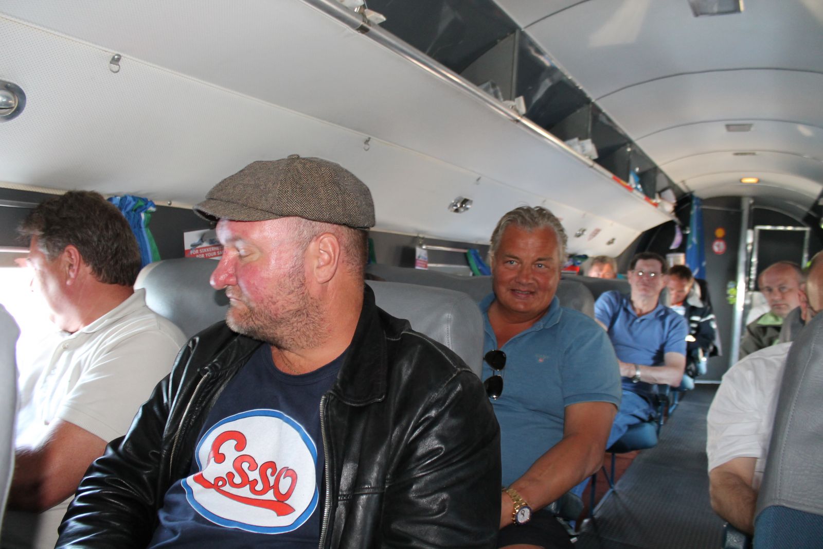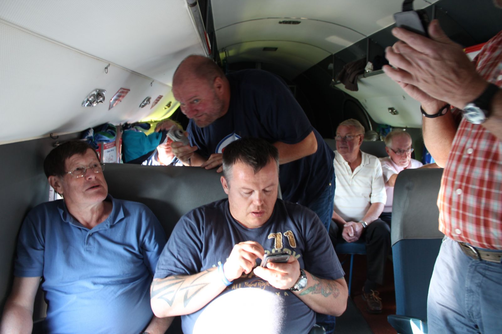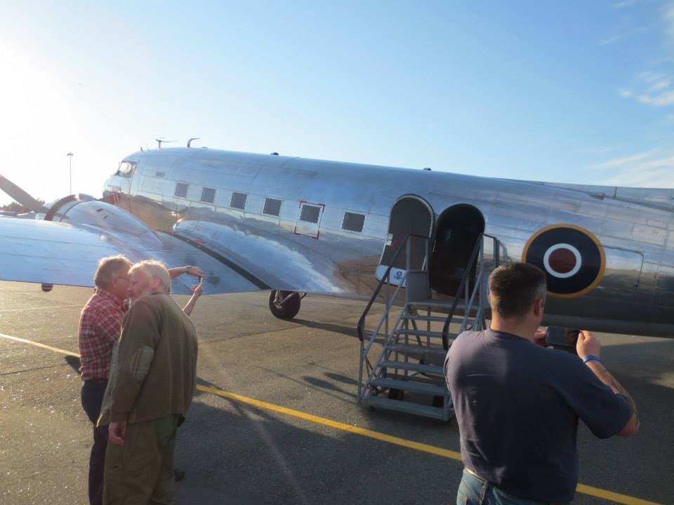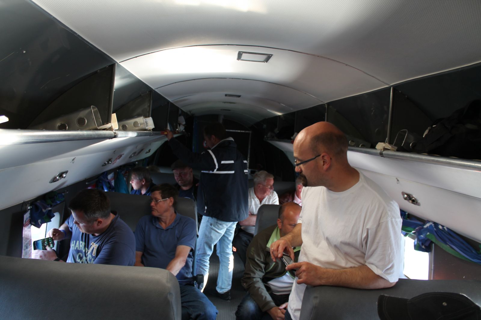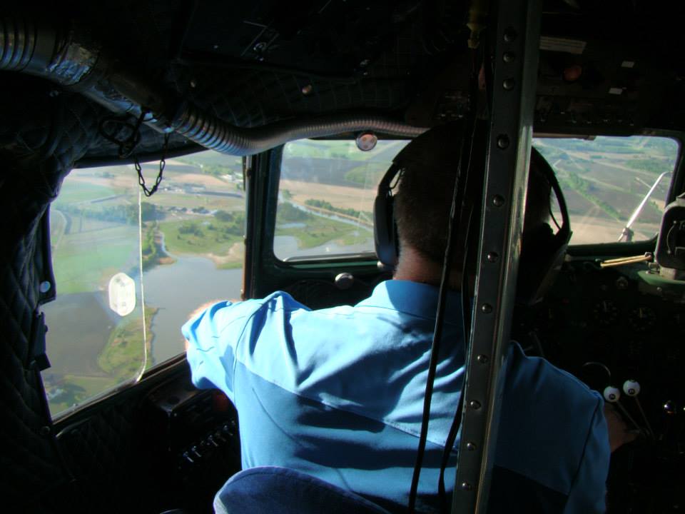 Mandag 27. mai opprant med et ufyselig vær. Vi hadde for mange måneder siden bestemt at denne dagen skulle vi fly Dakota. Utpå ettermiddagen sprakk skydekket opp og 19 mann kastet seg i klubbens buss og satte kursen for Torp. Innen vi kom dit var været helt strålende. Inn i den 70 år gamle maskinen strømmet vi forventningsfulle mannfolk. Flyet er voksen i alder, men den ene piloten ombord var eldre - han var 80 år. Samme pilot som fløy oss i 1993. Vi fløy kysten oppover, inn over Hurumlandet og opp Drammensfjorden. Gjorde en stor sving over Drammen, en stor sving over Konnerud før vi fortsatte videre til Hokksund og tok en æressving over der også. En drøy time med kos av høy kvalitet. Ingen frykt for gærninger i cocpit her, neida vi var alle der. Koselig og en smule eindommelig er det også å se piloten sitter med armen ut av vinduet. På vei hjem stoppet vi og nøt øl og krem på ei veikro. Bussen ble atter parkert under tak på Burud og en lang flott kvekld var brakt til ende. Stor suksess og jækla moro.