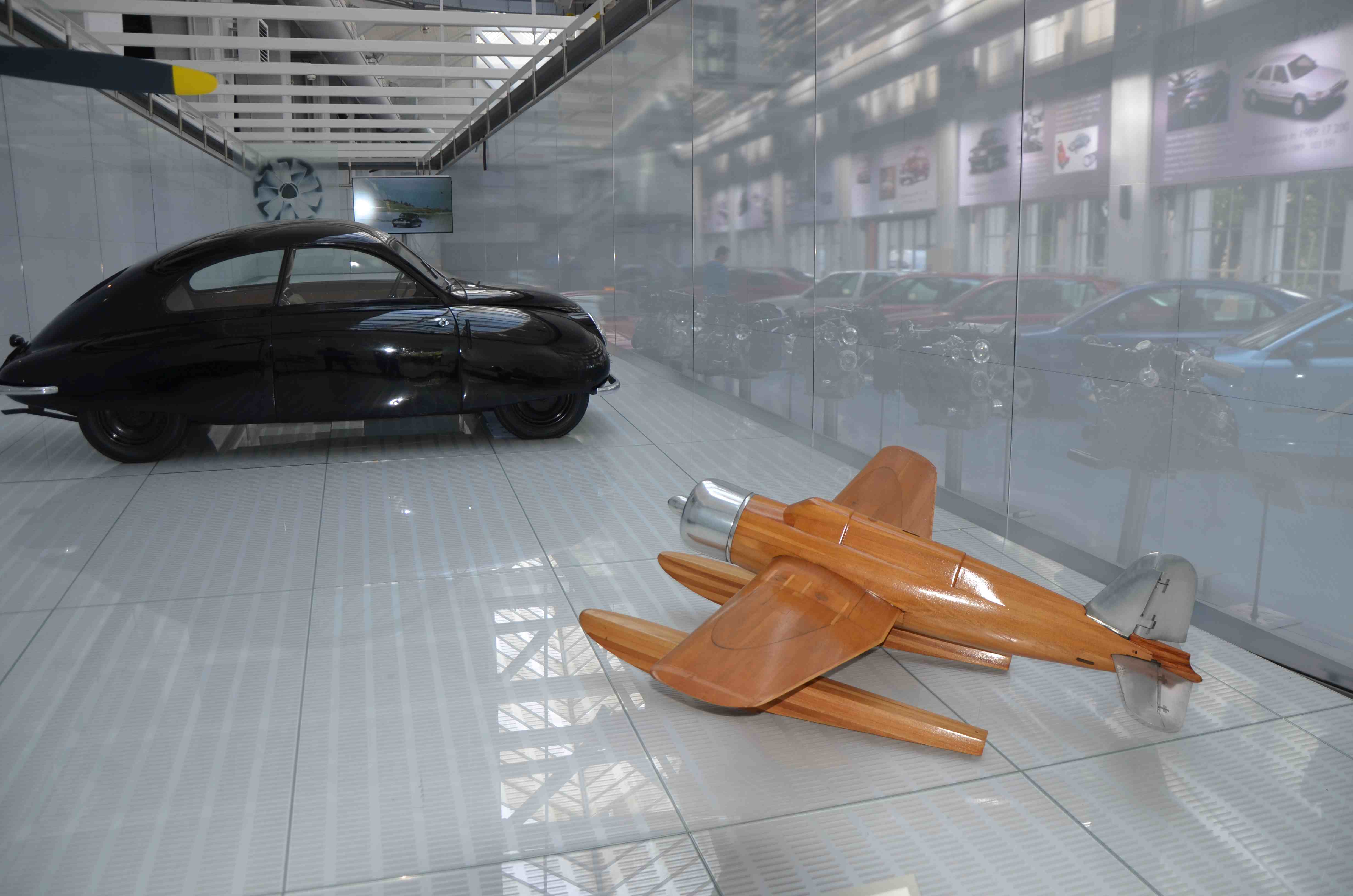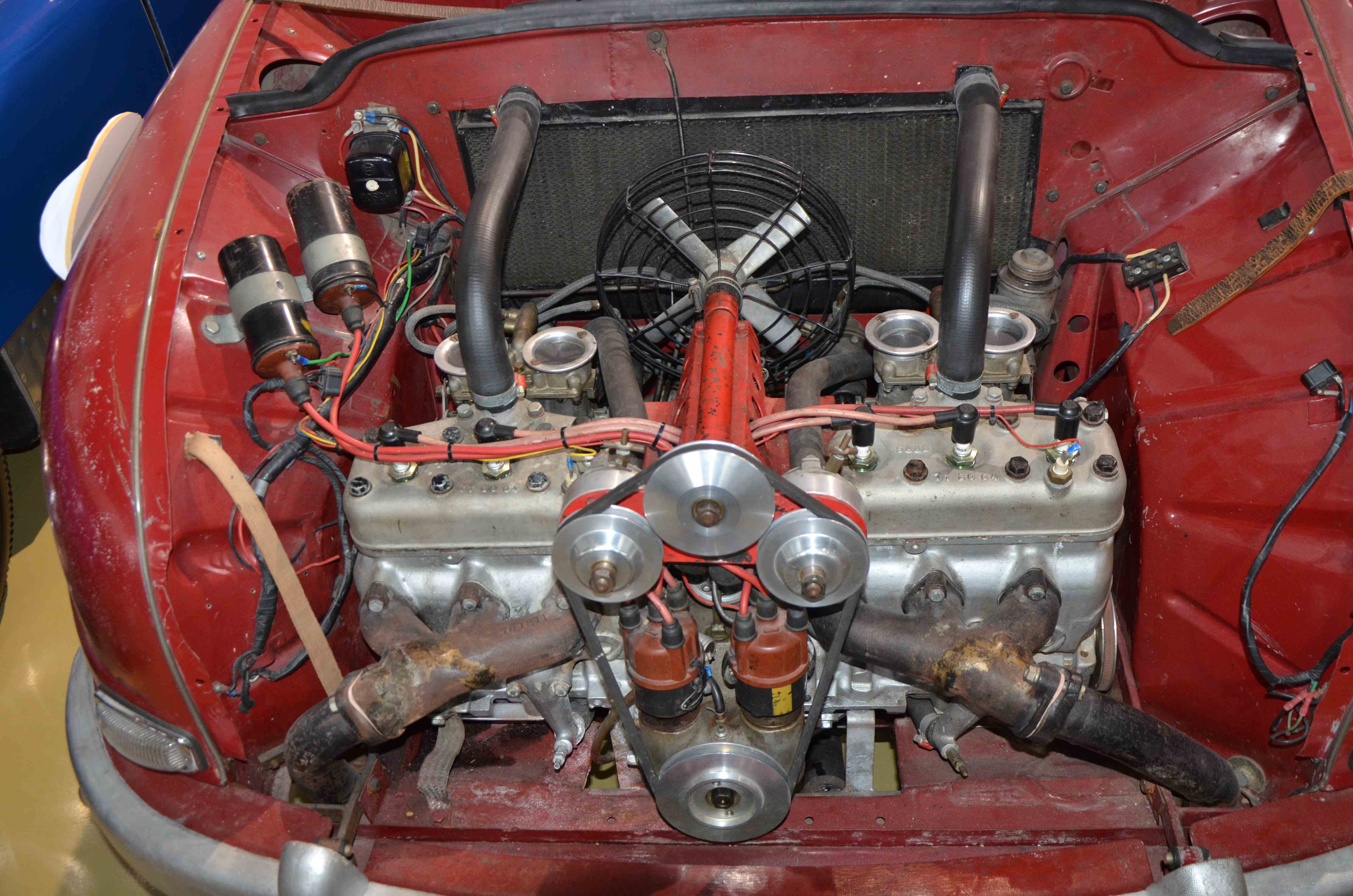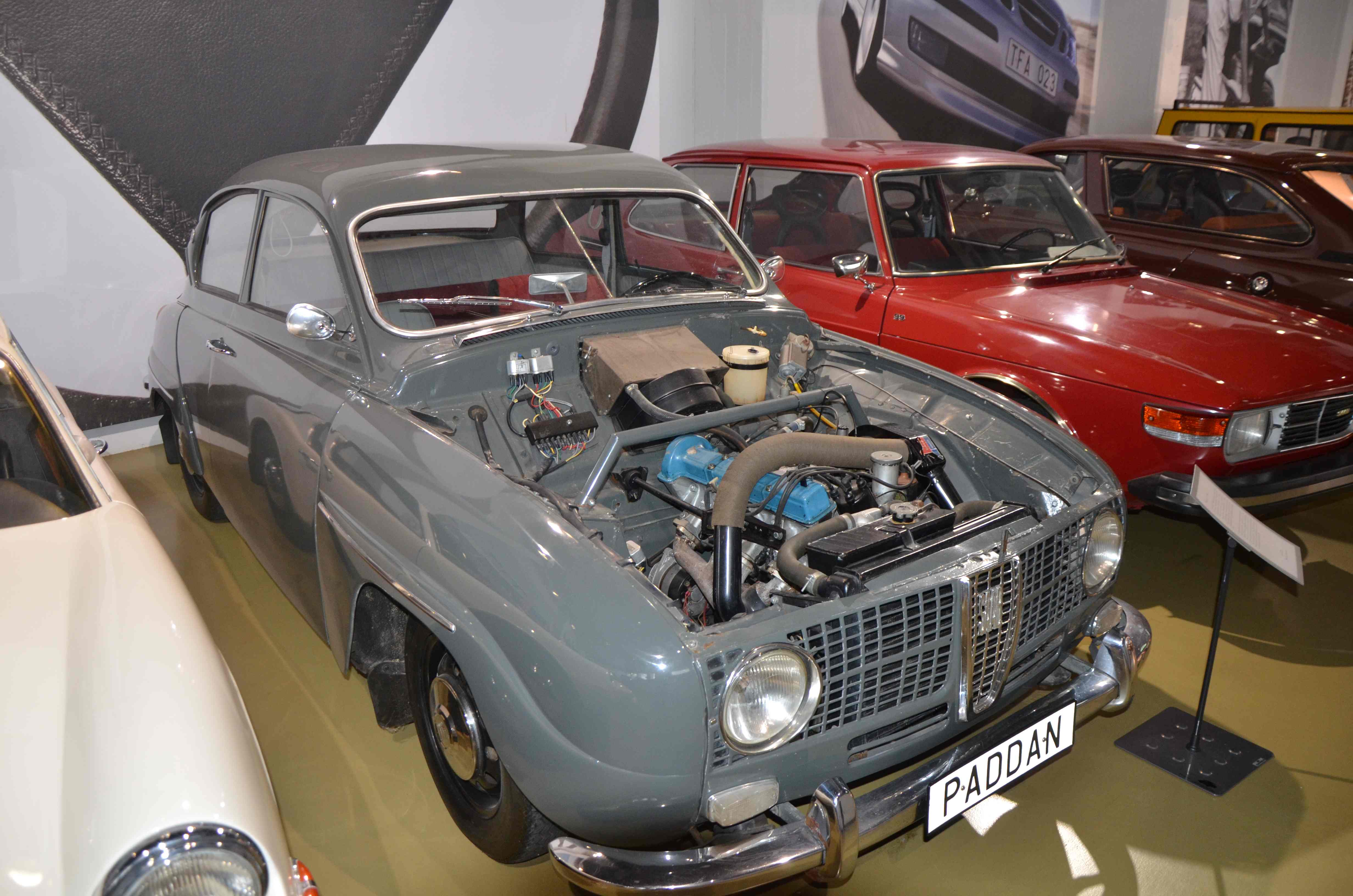 Legg spesilet merke til motorrommet på en rød bil hvor det er montert en tverrstilt seks-sylindret totaktsmotor. Eller rettere sagt to stk tresylindrede. Dette var et forsøk på videreutviklingen av bilen med to-taktsmotor som ikke hadde alt for mye hestekrefter. Forsøket endte opp med innkjøp av Ford sin V4 motor.