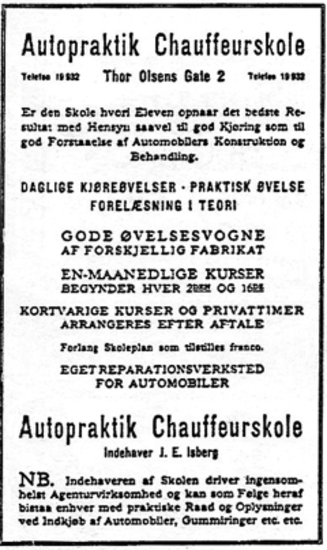Noe som antagelig er ukjent for mange er at Isberg også i en periode drev kjøreopplæring gjennom sin sjåførskole "Autopraktik Chauffeurskole". Denne annonsen er hentet fra en Oslo-avis.
