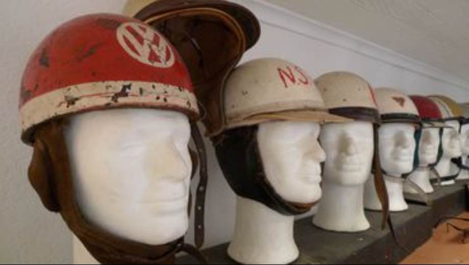 Hjelmer i forskjellige utførelser, noen i et materiale som ligner pappmaché, men også