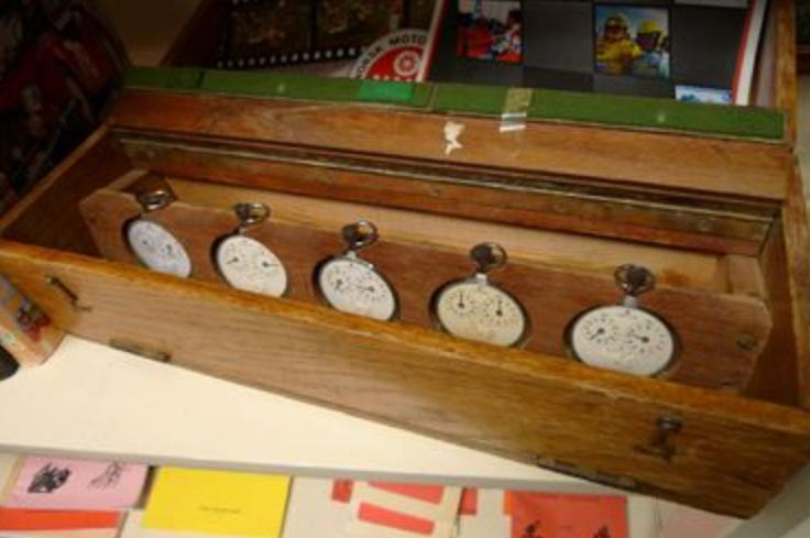 Klokkene ble startet samtidig ved at man vippet fram et lokk som var hengslet i bakkant av kassa slik at det lå over alle klokkene. Ved å trykke på lokket, satte man klokkene i gang samtidig. En fiffig sak, som er Reodor Felgen verdig! Til høyre: Ailo Gaups cross mc.