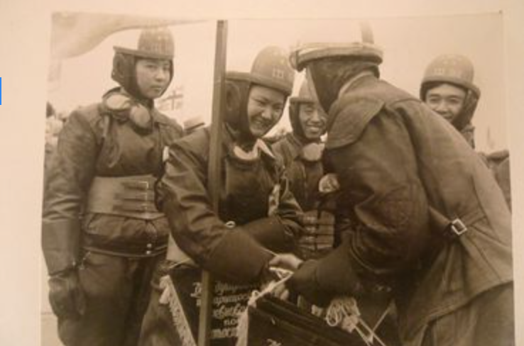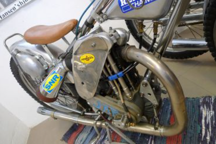 JAP 500 cc tilhørende Aage Hansen som var nordisk mester og erobret 7 NM-titler. Han kjørte proff for Ipswich i England i 1957. Aktiv fra 1953-66, fortsatt hobby. Til høyre: Usikker på hva dette er for noe, men vil tippe fra noe kinesisk opplegg, damer!! Legg merke til de solide nyrebeltene.