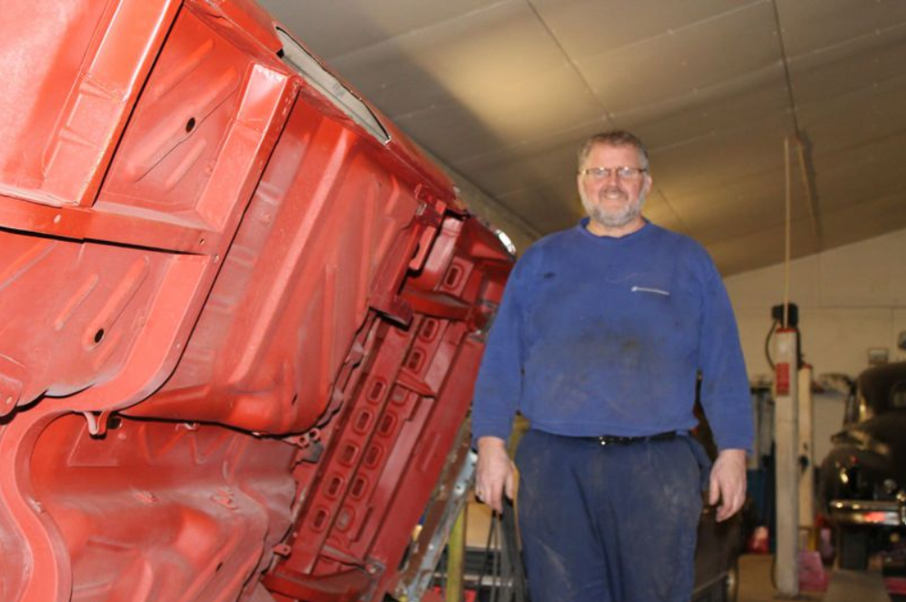 Ute i hallen var det litt - og bare litt - stell av bussen. Demonterte ei sprukken rute. Rolf Maurseth hadde mange timer denne dagen på sin 1965 Cortina st.v. Ren og pen bil