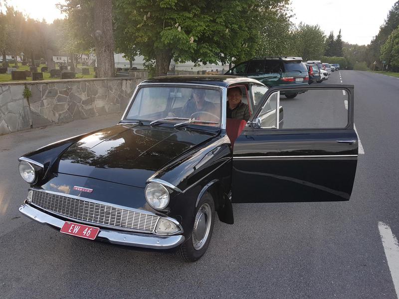 Og ikke minst er bilen til høyre en Ford. Den samme bilen som har stått i hallen på Burud i vinter. 1961 Anglia. I skrivende stund er bilen hos lakkereren og den blir å se på egne hjul igjen i sommer.