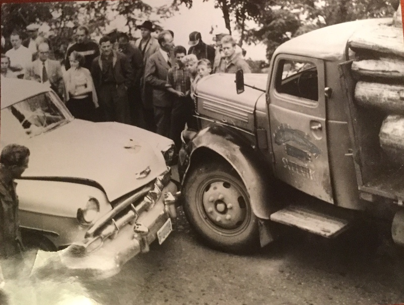 Noen har bomma litt på plassen her, og det endte med et smell. Tømmerbilen er en Volvo. Synd at navn og registreringsnummer er overstrøket, men lastebilen hørte åpenbart hjemme i Svelvik. Personbilen er en Chevrolet fra 1954. Orakelet Kjell Thon mente først det var en Two-Ten, men korrigerte seg selv pga fargen på rattet. Det er en Bel Air. Så det så........ Fotograf er Svein Wiborg, vi har fått det av broren Arve Wiborg.