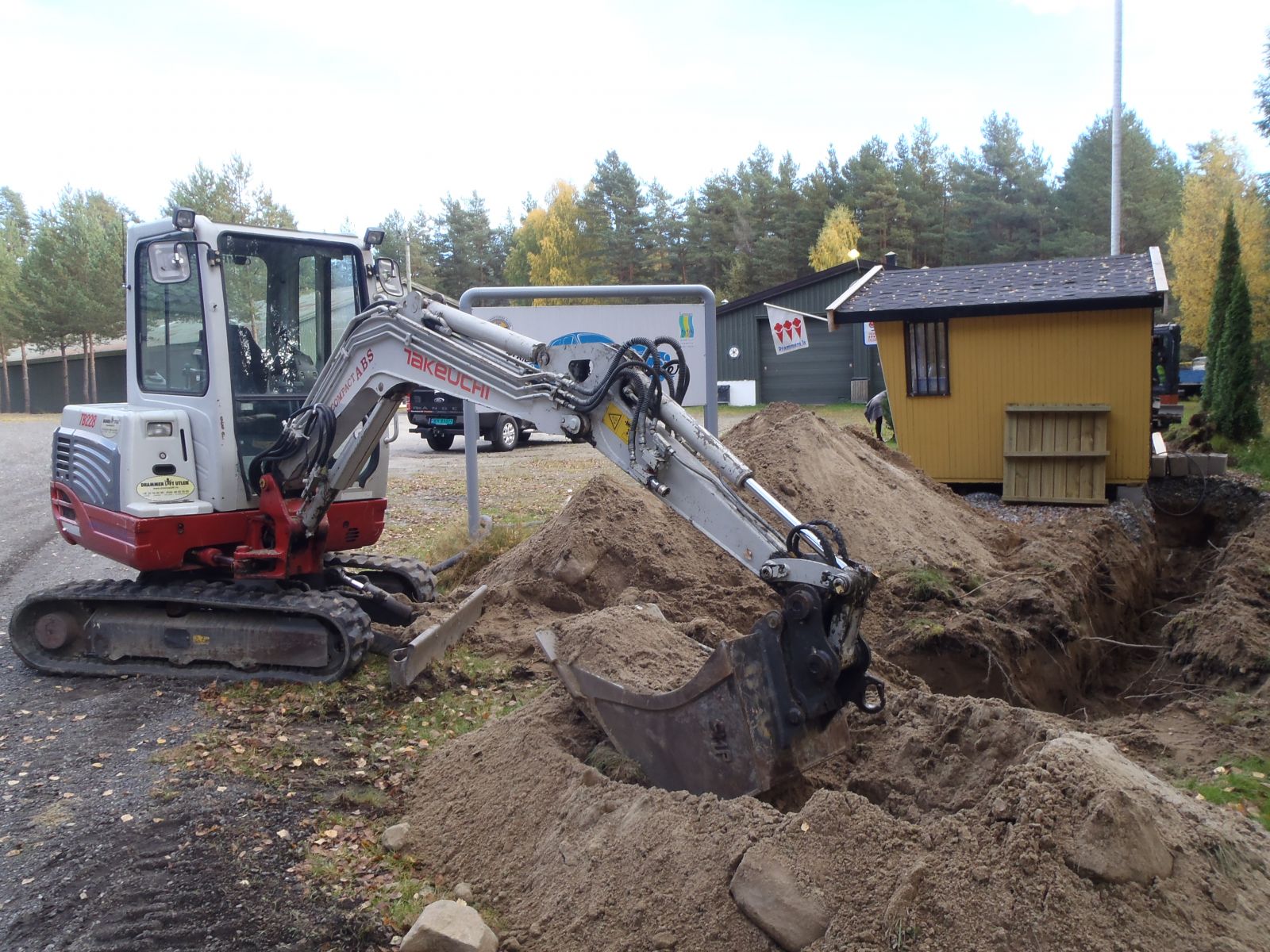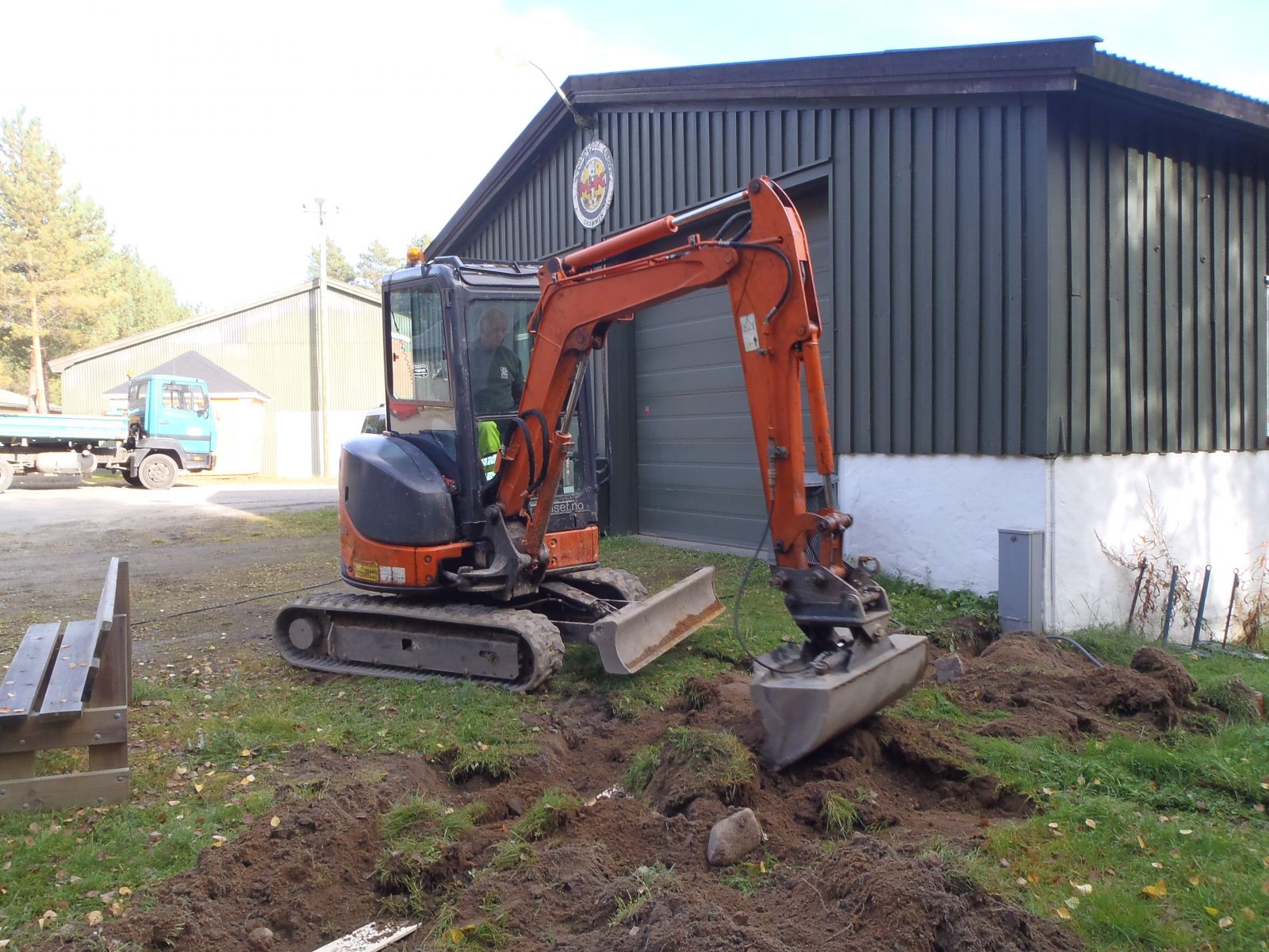 Fredag og lørdag og søndag i uke 39 har vi drivi og gravd i bakken. Det er drenert foran hall nummer 3. Satser på at det skal ta unna vannet som har trengt inn i bygget, men det er nok fortsatt viktig å brøyte slik at snøen ikke blir liggende oppetter veggen. Videre er det gravd grøfter og gjort klart for å legge inn vann og strøm i pølsebua. Vi hadde to gravemaskiner og en lastebil i drift. Stor takk til gravemaskinførerne Geir Andreassen og Sølve Kristoffer Wang som jobba som guder. Hr Holm og Hr Wang sr har fungert som prosjektledere - dvs gjort ingenting - og sjåfører for fyllesjuke maskinførere. Så nå blir det snart servert pølser trekt i friskt ferkvann. Gled eder allmue. Og send en varm takk til de som har gjort jobben når pølsefettet legger seg rundt hjerterota.