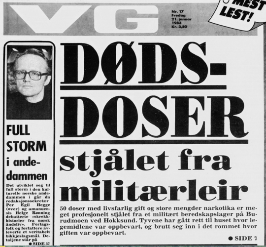 Som mange sikkert husker var det tidligere stadige innbrudd i Forsvarets anlegg rundt i landet. Et stort antall AG3 og rekylfrie kanoner stjålet i Vestby havnet sågar hos IRA i Nord-Irland etter spektakulære kriminelle manøvere som omfattet både dykkere og vanntette containere på havets bunn. Illegal våpenhandel har alltid vært god butikk. På Burud var det også innbrudd. I ekte detektimestil skar de seg gjennom taket inn i et av få temperaturregulerte rom. De gikk så målrettet til verks at det ikke finnes tvil om at tyvene på en eller annen måte hadde tilegnet seg kunnskap om hvor ting befant seg. Brukte til og med verktøy som tilhørte stedet. Det var intet innbrudd gjort på impuls. I 1983 forsvant store mengder medisiner og smertestillende. På den tiden så langt det største tyveriet i den kategorien. Blant annet elleve liter morfin ble borte. Og fire-fem tusen tabletter amfetamin, samt to-tre tusen tabletter smertestillende. Herav noe som heter Leptanal som man i følge Felleskatalogen må bruke hansker for å ta på. Kan skade huden. Og som nå av alle ting står på WADA’s dopingliste. Også ble det borte tabletter ved navn Pavulon. Dette siste er et åndedrettslammende medikament som ikke lenger er i bruk her til lands, og som det ikke var/er lov å eksportere til bl.a. USA fordi det er godt egnet til å avlive forbrytere med. Disse to nevnte medikamentene har ingen ruseffekt, men er livsfarlige da de fører til lammelser. Tilsvarende stoff som Arnfinn Nesset ble dømt for å ha brukt til å ta livet av tjueto mennesker med på et sykehjem i Orkdal. Litt av en cocktail de stakk av med disse røverne som altså tok turen til Burud i januarmørket i 1983. Adgang til den store safen fikk bandittene ved å bruke skjærebrenner. Datidens verdi på det illegale markedet ble anslått til fem millioner kroner – tretten og en halv million 2018-kroner. For å prøve å finne ut litt mer av denne saken er det blitt involvert aktive og pensjonerte politifolk, hundefører, narkospaner, lege og gamle lensmenn. Til og med en gammal banditt er forespurt. Noen husker saken og det kan konstateres at den aldri ble oppklart. Nå er forholdet foreldet med god margin, så om noen skulle vite noe hadde det vært interessant.